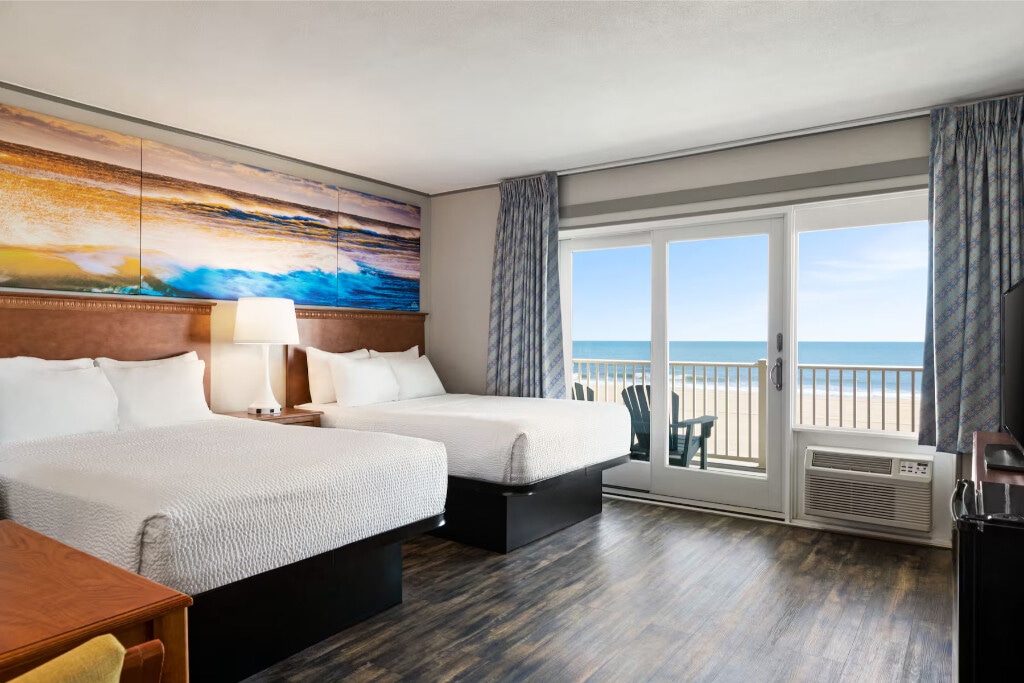 Immerse yourself in the boardwalk experience with this classic oceanfront room. Featuring two double beds and a private balcony directly facing the waves, you can enjoy the ocean breeze 24/7. Modern amenities include a flat-screen TV, refrigerator, and microwave, offering a seamless blend of seaside charm and practical utility for your Maryland coastal adventure.