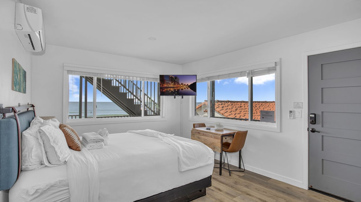 A pocos pasos del agua, nuestro estudio recién renovado en Oceanside ofrece un refugio idílico. Disfruta del ambiente relajante de su decoración inspirada en la playa, mientras disfrutas de la inigualable entorno frente al mar. Contempla por la ventana y deja que las majestuosas olas, las vibrantes puestas de sol y la grandeza de la naturaleza cautiven tus sentidos. Descubre el viaje de tu vida, ya que nuestro encantador refugio te atrae para una experiencia inolvidable.