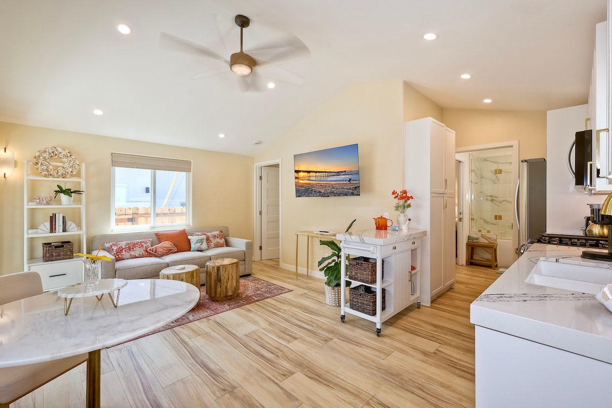 Nuestra unidad Studio ofrece lo mejor de la vida de playa en la costa de California. Cerca de la arena, el centro de la ciudad, el muelle y atracciones famosas como Disneyland, SeaWorld y Legoland, ¡te encantará este lugar por su proximidad al océano, su comodidad y su ambiente! Esta suite incluye una cama tamaño queen, comedor pequeño, un baño con ducha a ras de suelo y una pequeña cocina. Puedes ver las olas, las puestas de sol o los surfistas justo en la puerta principal.