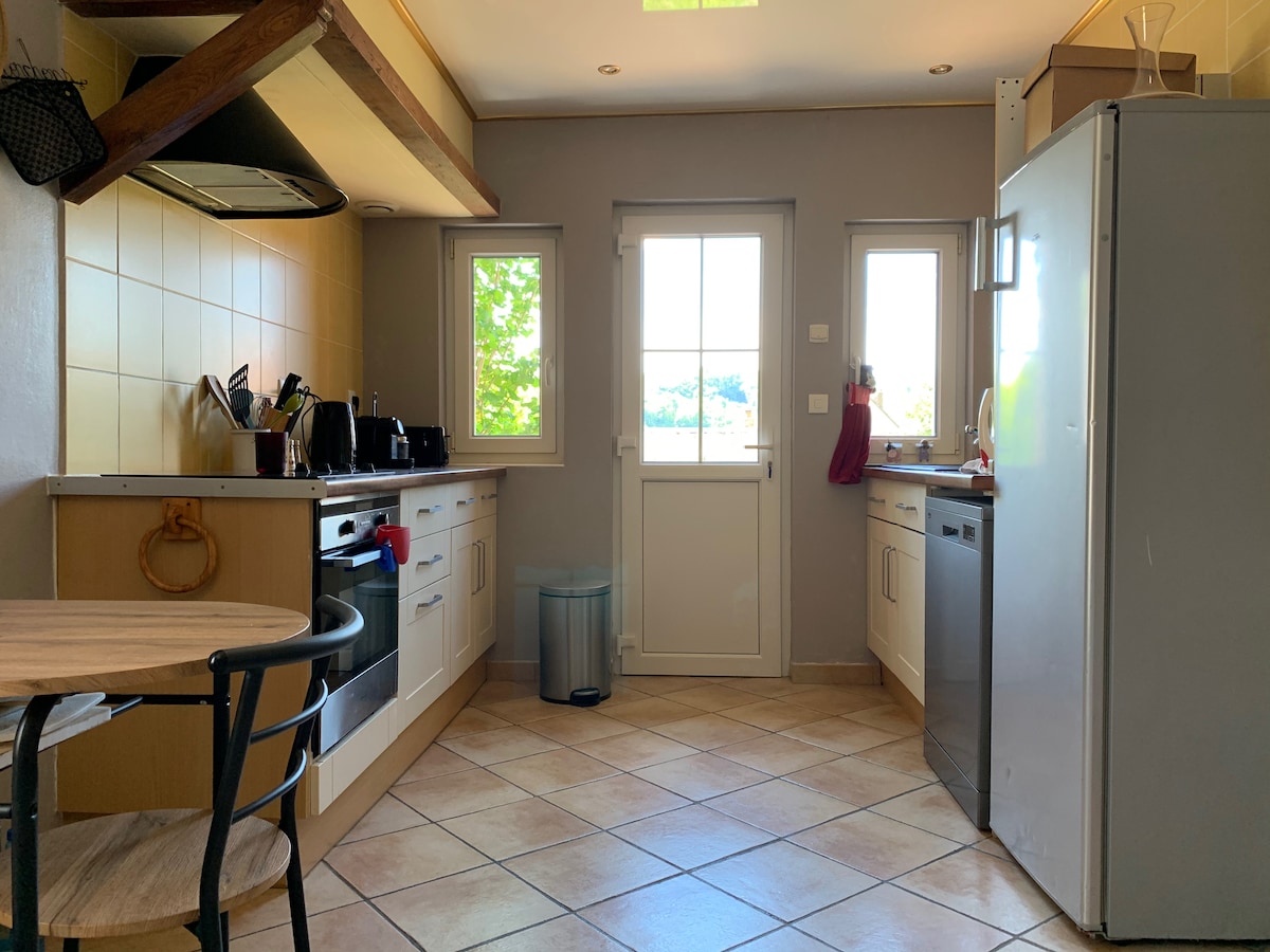 Casa rural de 100 m² totalmente nueva construida en un granero. Calefacción eléctrica con estufa de leña. Cocina totalmente equipada (lavavajillas, nevera, congelador, horno + microondas, etc.). Ideal para descansar y disfrutar de la tranquilidad de la naturaleza. Situado en pleno campo sin vecinos. Propiedad para compartir con la propietaria. rincón terraza privada, barbacoa, columpio, tobogán. WIFI gratuito. Netflix Tasa turística adicional: 1,21 /adulto/día