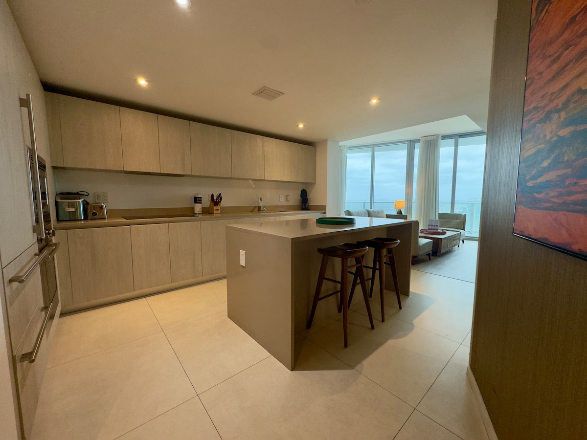 Modern and recently updated suite with 3 large bedrooms and 3 full bathrooms. Wrap around porch with spectacular, breathtaking, panoramic views of the ocean front from the 37th floor of the Lyfe Condominium. Great location, a 1 minute walk to the beach. A 30-min drive to Miami Airport or a 20 min ride to Fort L. Airport. The condo is comfortable and spacious, has 5 beds 1 king, 4 twin beds, a living room couch converts to sleep 2, has a fully equipped kitchen, TV in every room, and free WiFi.