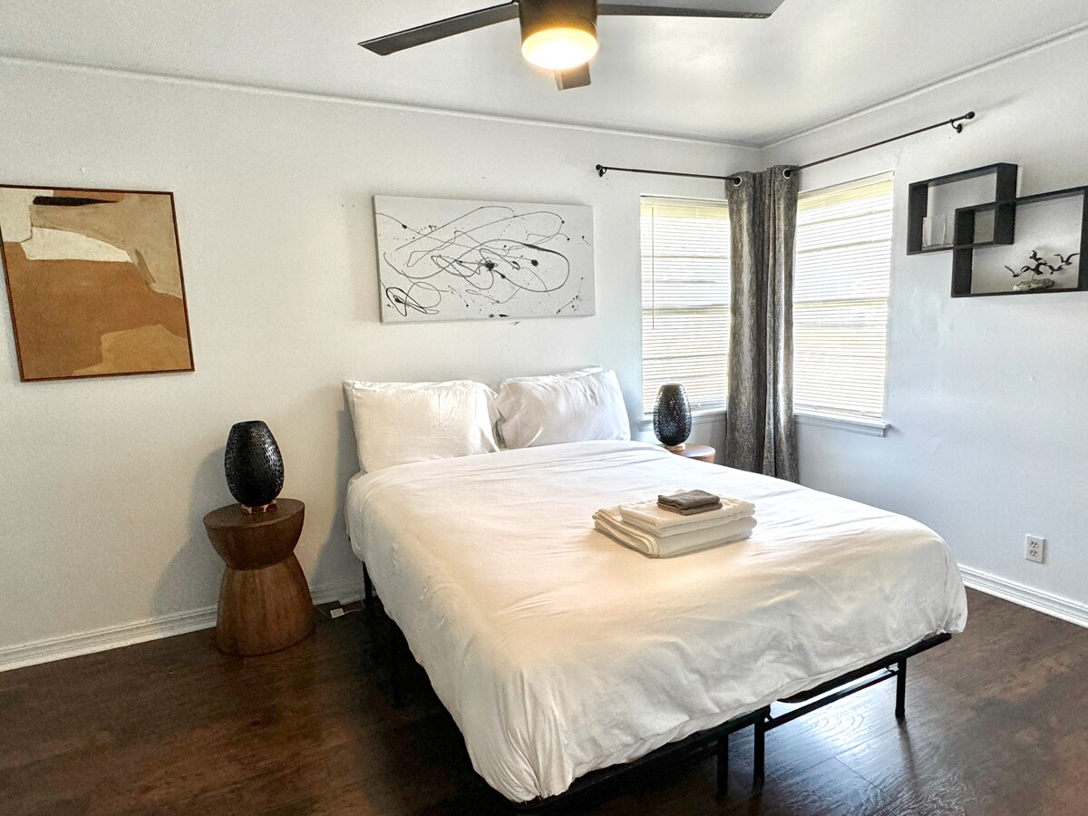 Una maravillosa suite principal con temática de playa ha atracado en OKC, situada en el centro, cerca del Centro Médico OU, el Capitolio, el centro de la ciudad y mucho más. LGBTQ-friendly, este es el hogar de 2 profesionales de bienes raíces. Totalmente remodelado. Diseño elegante. Bañera de lujo para que empapes tu cuerpo mientras escuchas música relajante. Ven a alojarte en nuestra suite para disfrutar de una de las mejores casas remodeladas de Oklahoma City y enjuagarte en nuestra moderna ducha con temática de playa o descansar en nuestra lujosa cama de espuma.