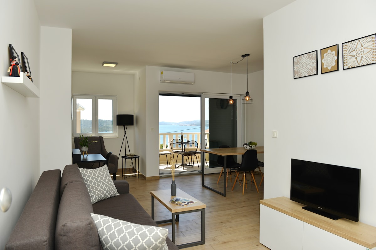The apartment was newly built, 2021.The apartment is in a block,connected to a family house.. It has two floors with a separate entrance. Guests can use a part of the garden in front of the apartment with a table and chairs. Atractive beach with plenty things to do is 2 minutes . The apartment you can enjoy and relax, and if you want any other activity ,its near by .Trogir is a 15 minute walk and there is a boat every 10 minutes .Enjoy the sun and the Adriatic sea in an attractive location ''.