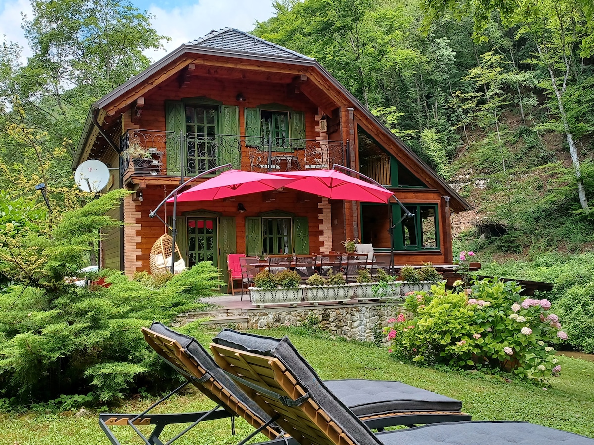 Crea momentos inolvidables en este alojamiento único y lujoso de 4 estrellas, adecuado para familias, en el corazón del paisaje virgen del parque natural Žumberak, a orillas del suave río de montaña Slapnica, donde no necesitas aire acondicionado, en las inmediaciones de dos cascadas cuya belleza te sorprenderá. Trata la respiración. Disfruta de un paseo por la carretera forestal a lo largo del cañón de 9 km de largo del río Slapnica o simplemente encuentra tu paz en la privacidad de la propiedad.