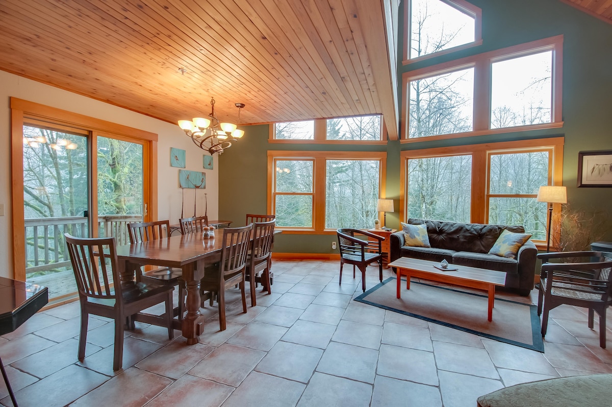 Nuestro chalet en Mt. Hood tiene una arquitectura impresionante, está ubicado junto a una calle tranquila y da a un extenso bosque privado con un sendero privado hasta el arroyo Welches. Disfruta de varios niveles interiores y explora las terrazas al aire libre y los hermosos espacios de jardín en terrazas y sumérgete en el jacuzzi de las aguas termales de Oregón. El alojamiento está equipado con wifi rápido y streaming. Somos anfitriones experimentados y receptivos que estarán encantados de ayudarte a aprovechar al máximo tu visita. Consulta nuestra guía local para conocer nuestros restaurantes y caminatas favoritos.