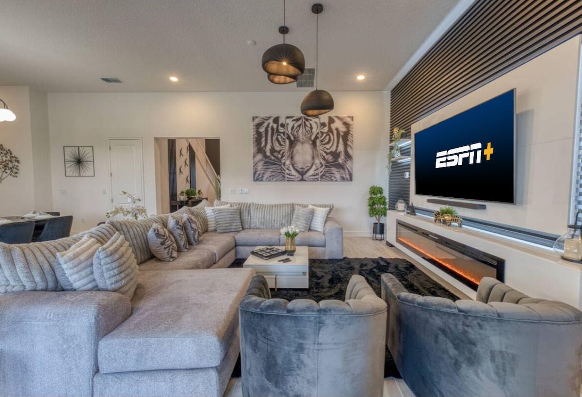 Increíble casa de lujo moderna a estrenar en Encore Resort Reunion. SE ADMITEN MASCOTAS y minutos de todos los parques temáticos. NUEVO HOGAR. Piscina privada y spa / sala de juegos / cine / gimnasio / sillón de masaje / chimenea / PS5 / juegos de mesa y mucho más. Abraza lo extraordinario y reserva tu estadía en nuestro alojamiento, donde el lujo y el entretenimiento se unen para una experiencia de vacaciones inolvidable. ** Consulta las reglas antes de reservar. El acceso al parque acuático no está incluido. **