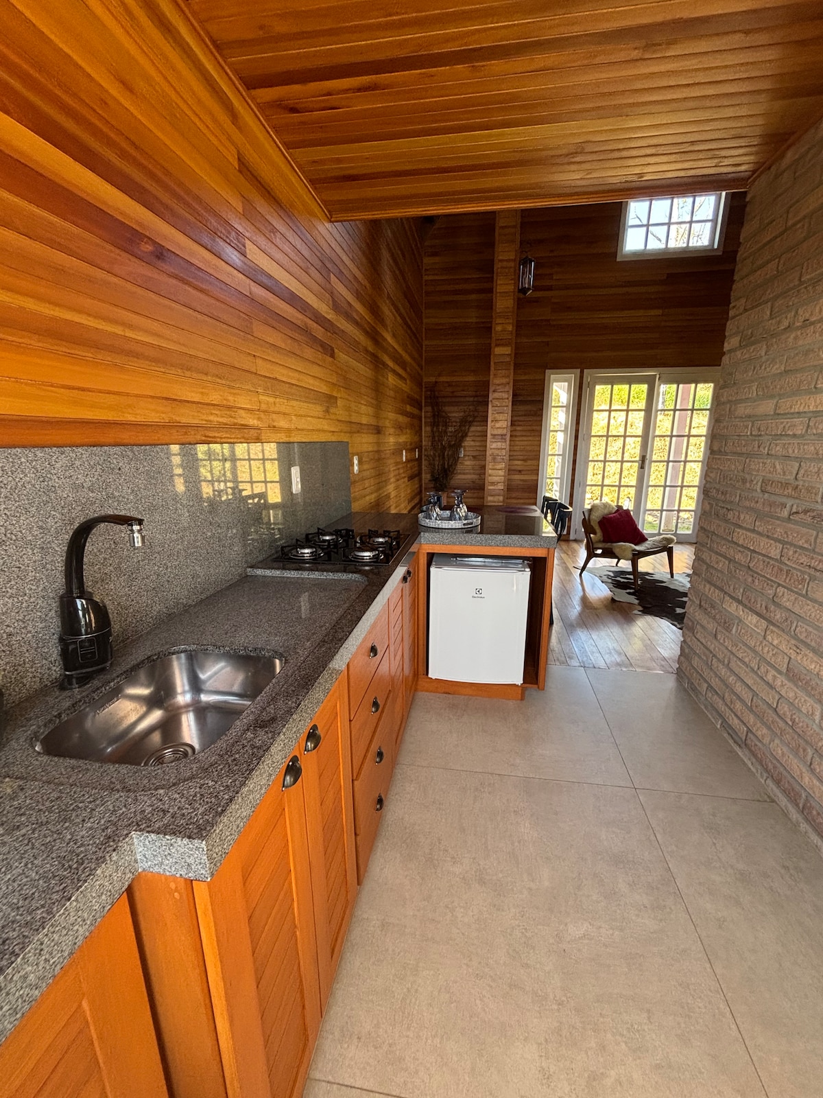Cerca de la SERRA DO RIO DO RASTRO. Cabaña de madera rodeada de árboles y flores, cerca de un hermoso río. Donde es posible despertarse con el canto de los pájaros. Cabaña ideal para parejas que buscan tranquilidad, exclusividad y privacidad. Al relajarse en el hidromasaje durante el día, el sol entra por la abertura de vidrio y aporta una sensación de calidez y confort, con vistas al jardín y a los colibríes que suelen aparecer en el jacuzzi. Todos los grifos con agua caliente, calefacción a gas.