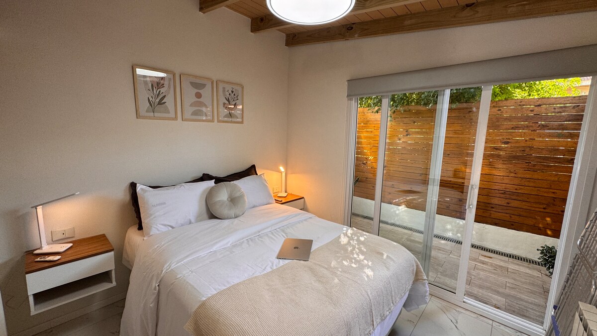 Dormitorio con sommier matrimonial, TV con Wi-Fi y plataformas activas (Netflix, Disney+, Max, Paramount+), mesas de luz con veladores y cargador magnético, caja de seguridad, ventilador de techo y salida a balcón. Calefacción por radiadores en cocina y dormitorio, toallero térmico en baño con bañera. Cocina con horno, microondas, tostadora, pava eléctrica, batería de acero, vajilla Verbano y utensilios. Patio con mesa y sillas de madera.
