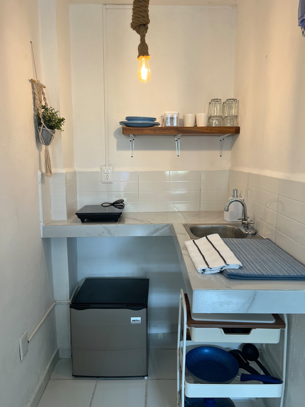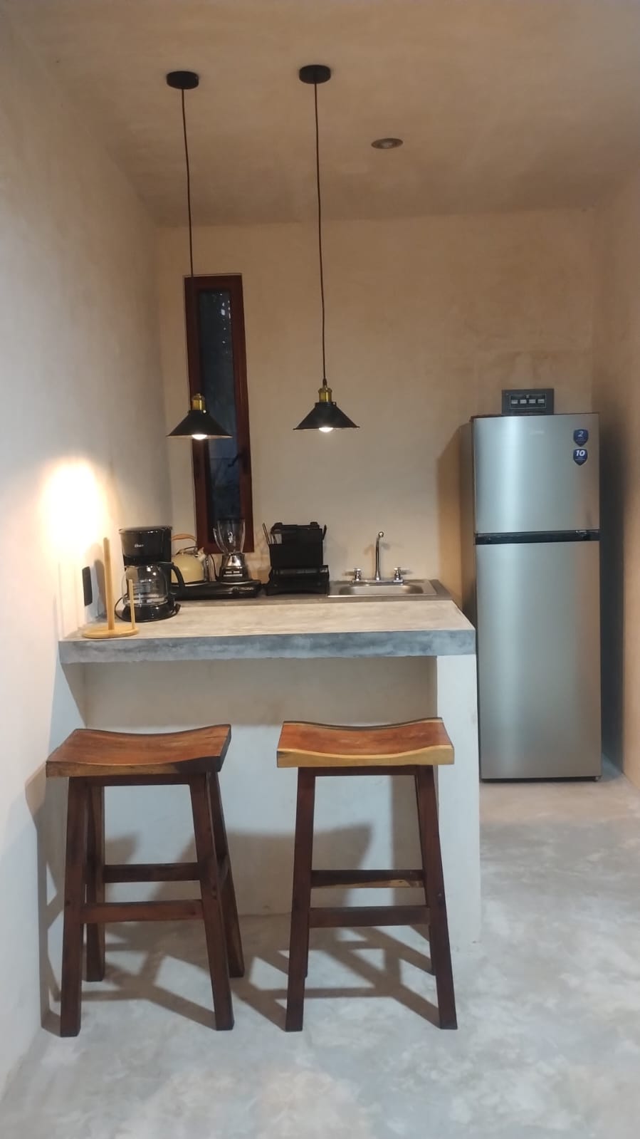 Cómoda habitación con todo lo necesario para descansar, ubicada en una zona tranquila dentro de Bacalar y muy cerca del Súper Aki y Oxxo. Cuenta con wifi, A.A., agua caliente, t.v. Smart, NETFLIX, frigo, licuadora, cafetera, horno de microondas, dispensador de agua, 2 cómodas camas, baño propio, estacionamiento privado, Área de cocina compartida en el exterior con ESTUFA DE GAS, ASADOR DE CARNES al carbón, utensilios de cocina, café, azúcar, y áreas comunes exteriores. FACTURAMOS