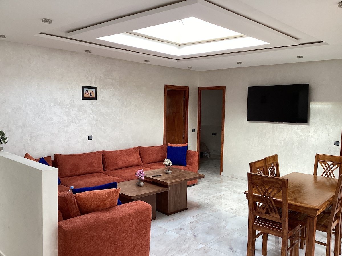 ¡Disfruta de un capricho alojándote en este apartamento luminoso y moderno! ¡Todo es cómodo en este apartamento, las obras de arte y la decoración dicen mucho sobre la belleza! ¡Tú y tu familia o amigos pueden disfrutar el uno del otro sin sentirse apretados! si respiras aire fresco mientras disfrutas de una taza de café/té durante el día mientras disfrutas de la tranquila vista que este apartamento tiene para ofrecer. este es tu hogar lejos de casa cuando explores Agadir.