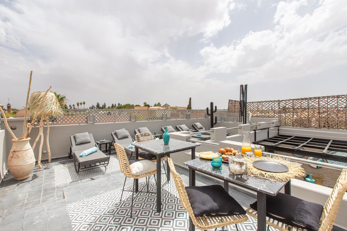 Notre Riad est une promesse d'évasion. Imaginez vos matinées bercées par le chant des oiseaux dans le patio et vos soirées sur la terrasse surplombant la ville rouge. Un mélange raffiné de zelliges traditionnels et de confort contemporain. Un salon de lecture pour s'évader, des chambres élégantes pour se ressourcer. Un patio rafraîchissant, pour le café du matin et un rooftop pour savourer le coucher du soleil. Hospitalité marocaine et confort absolu : votre parenthèse enchantée commence ici.