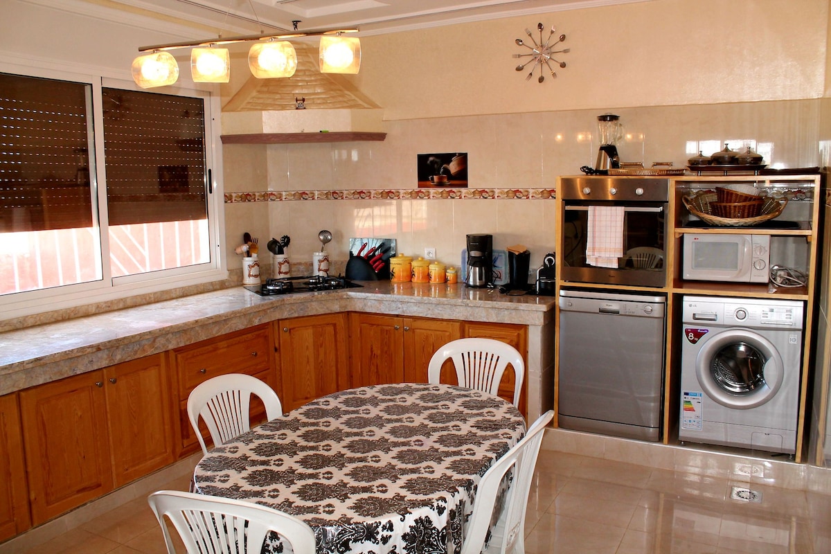 Este alojamiento elegante es perfecto para grupos. Hermosa casa en una zona tranquila con 2 dormitorios, una cama de matrimonio y la otra 2 camas individuales, cocina amueblada, sala de estar con 3 sofás, gran sala de estar con 5 sofá, baño, terraza que también puede servir como estacionamiento, a 60 km de Saidia