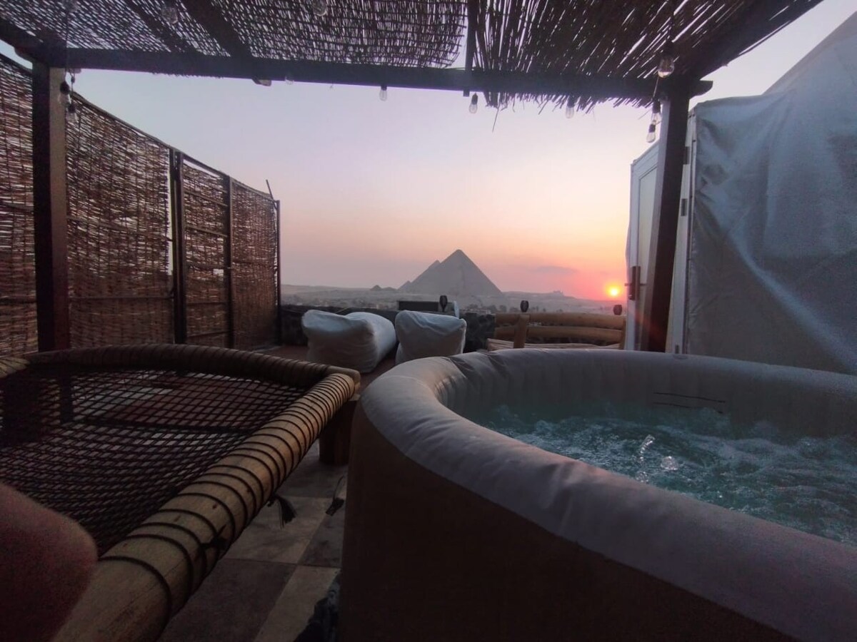 Disfruta de tu estancia con vistas panorámicas a las pirámides de Guiza y la esfinge ¡Sí! Las vistas y las imágenes son 100 % reales. (Asegúrate de consultar también nuestros otros anuncios) Disfruta de una vista impresionante de todas las pirámides de Guiza desde cualquier lugar dentro de este estudio oriental contemporáneo o mientras te relajas en el jacuzzi. También está a 10 minutos a pie de la puerta de entrada de las pirámides. Para aprovechar al máximo tu viaje, ¡no te pierdas nuestras experiencias! Tenemos el firme compromiso de ofrecer a nuestros huéspedes la hospitalidad mágica que se merecen.
