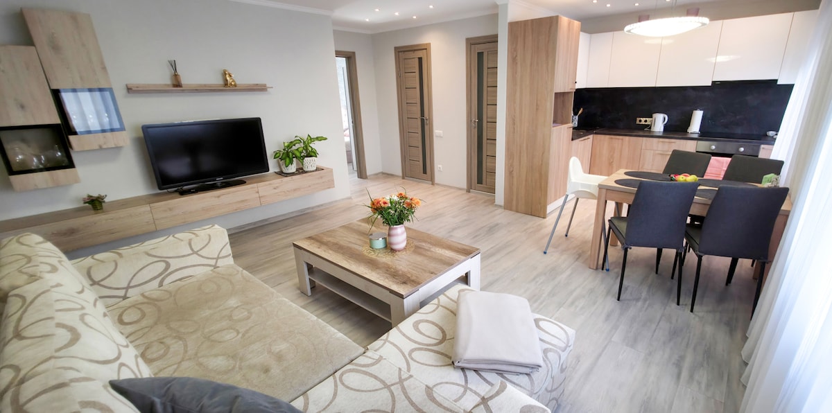 Apartamento recientemente renovado en el corazón del casco antiguo de Ventspils, la zona más encantadora y vibrante de la ciudad. A solo 2–4 minutos a pie de los mejores cafés locales, panaderías, el paseo del río Ventas, mercado, cine, spa, piscina, gimnasio, playa a 15 minutos, todo lo que necesitas está a la vuelta de la esquina. Diseñado para ser acogedor y moderno. Está totalmente equipado con comodidades de alta gama, como una cafetera premium, lavavajillas, lavadora/secadora y todo lo que necesitas para unas vacaciones relajantes o un viaje de trabajo productivo.