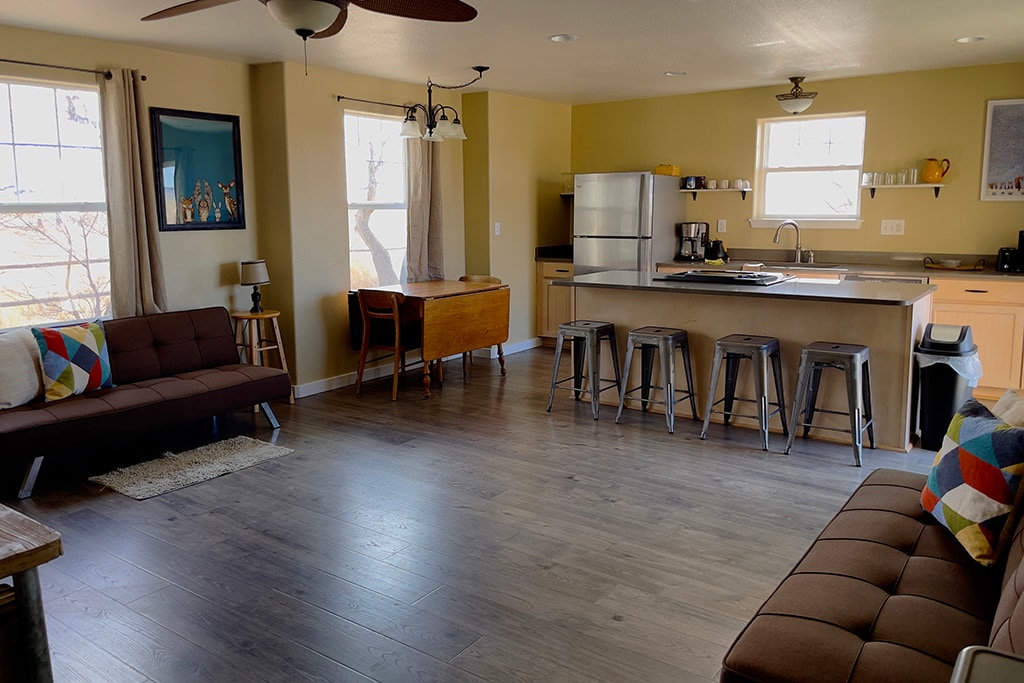 Tranquilo dormitorio privado y cocina americana aislados de la casa principal con solárium de uso común entre ambos. Entorno rural junto a la autopista 44, a pocos minutos del aeropuerto de Rapid City. Toma de carga de destino Tesla de 11 kW en tu garaje, accesible directamente desde la suite. Internet Starlink de 150 Mbps. Se admiten mascotas amistosas con puerta para mascotas desde la suite hasta el patio trasero vallado y el patio aislado de nuestro perro y gato. El baño privado tiene calefacción en el suelo y agua caliente sin fin con calentador de agua de flujo continuo.