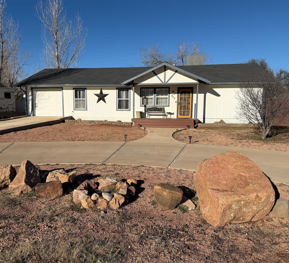 Cabaña de 1935 totalmente renovada junto al parque Green Valley, compatible con la carga de vehículos recreativos y eléctricos. Camina por las tiendas/boutiques/teatro/restaurantes de Main St al este o la cabaña y museo Zane Grey/parques/pesca/kayak/parque infantil al oeste de la propiedad. Hay mucho aparcamiento para vehículos, remolques para todoterreno o incluso una autocaravana. El patio delantero está vallado y cerrado para perros. Conciertos en el parque, fuegos artificiales del 4 de julio desde el porche, ciclismo de montaña, paseos en OHV, rodeos y mucho más. Aproximadamente a una hora en coche del valle de PHX.