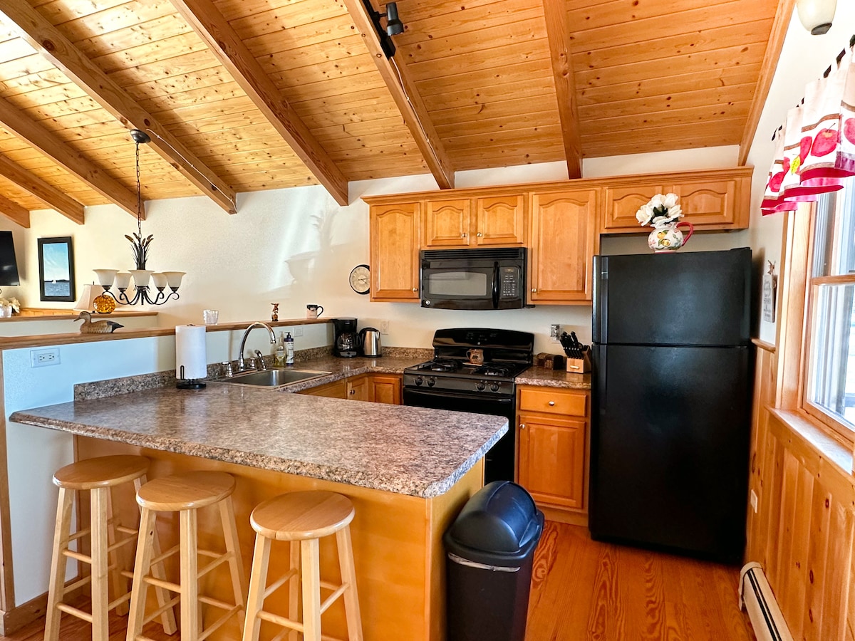 ¡Escápate a una casa de ensueño con estructura de madera escondida en los bosques de Maine! Te esperan vigas elevadas, pisos con calefacción radiante, una cama loft tamaño king y una chimenea crepitante. Toma un café en una de las dos terrazas, camina por la montaña Bradbury (a 3 minutos), compra en Freeport (a 10 minutos) o cena en Portland (a 20 minutos) y luego regresa a tu acogedor refugio bajo las estrellas. Cocina completa, techos abovedados, pisos de calor radiante, entrada privada, fogata y vistas tranquilas al bosque lo convierten en el refugio perfecto durante todo el año.