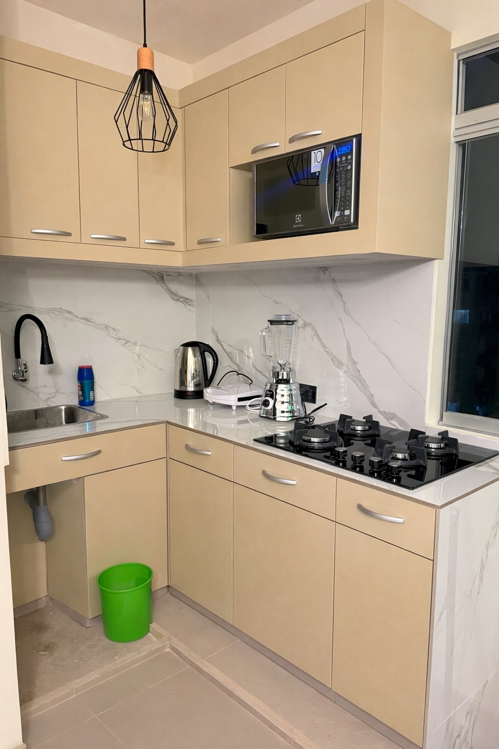 Bonito departamento de estreno en 2do piso, a 5 minutos en auto o 10min en bus para el centro de Ilo. Zona segura, al lado de la comisaría de Pacocha y Compañía de bomberos, se encuentra también cerca del Banco BCP y del Mercado principal. A 10 minutos caminando de la playa Montecarlo y Discotecas más concurridas. Cocina totalmente equipada, una cama de 2 plazas y una cama de plaza y media, ducha con terma eléctrica.