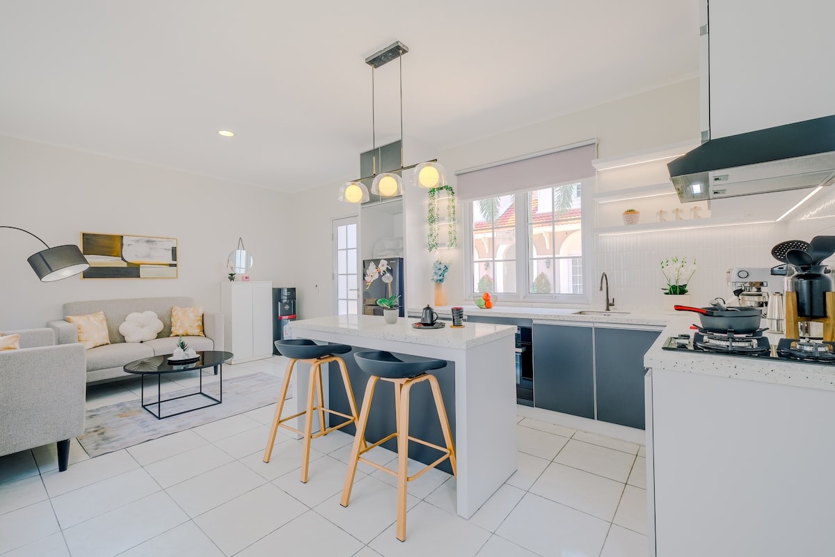 La acogedora sala de estar de lujo «Hagu» te ofrece un diseño interior, vistas y ubicación impresionantes. Te alojarás en un apartamento de un dormitorio de 58 metros cuadrados con servicios e instalaciones de lujo. Nuestra sala de estar Hagu te ofrece un televisor inteligente UHD de 65 pulgadas, un gran sofá en forma de L y elegantes pinturas que te ofrecen un panorama perfecto de la vista de la ciudad CBD BSD. El dormitorio «Hagu» te mima con una cama tamaño king y un espacio de trabajo con vistas a la ciudad. Es ideal para ejecutivos de negocios con estancias largas y buscadores de ocio.