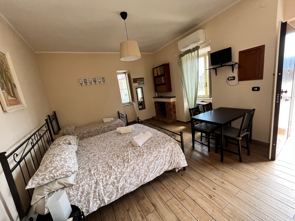 Estudio luminoso independiente (dentro de una estructura más amplia) equipado con cama doble, sofá cama individual (y cuna bajo petición) con aire acondicionado, secador de pelo, wifi gratuito y smartTV, con baño privado y zona de cocina con placa de inducción. Del 15 de mayo al 15 de septiembre se puede disfrutar del espacio exterior con piscina. Además, a partir del 1 de octubre, por un suplemento razonable, está disponible el espacio «tavernetta», para disfrutar de más distracciones y momentos de relax.