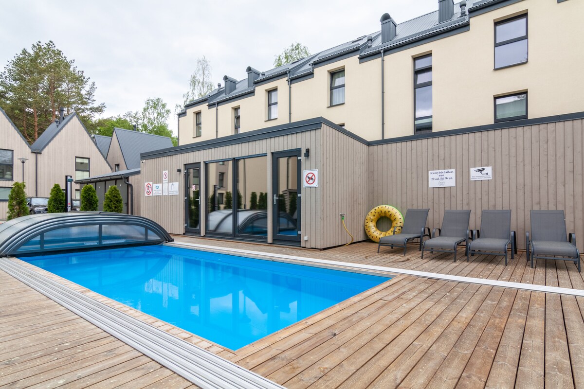 Descubre la tranquilidad y el lujo en el impresionante apartamento Sunset en el complejo «Mano Jūra 3». Este moderno apartamento cuenta con una amplia terraza, una piscina ecológica, un jacuzzi al aire libre y varios otros servicios. En el interior, encontrarás una cocina totalmente equipada, una acogedora sala de estar con sofá cama, un dormitorio bien equipado y un baño contemporáneo. Disfruta de wifi rápido, Smart TV y aire acondicionado para la máxima comodidad. Perfecto para unas vacaciones familiares o una escapada romántica.