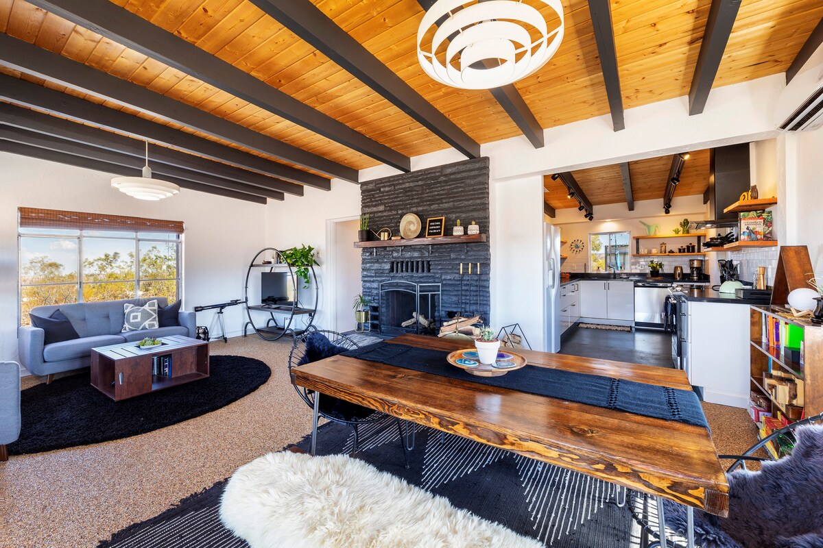¡Un refugio consciente del diseño con vistas a la montaña! >>este es el lugar que honra la forma y la función por igual con accesorios de latón macizo, una barra de cobre, suelos de hormigón teñido y sábanas de algodón Matteo vintage. Los elementos modernos y vintage seleccionados se combinan para cultivar un espacio de descanso, reflexión y flujo creativo. Espacio exterior privado con chimenea de gas y parrilla. A poca distancia a pie del Museo de Arte al Aire Libre Noah Purifoys. A 8 minutos del centro de la ciudad y a 15 del parque. Nuestro moderno santuario es ideal para el alma artística.