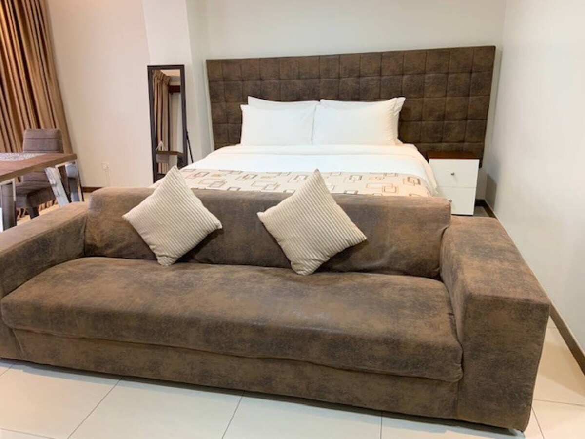Relájate en este espacio tranquilo y elegante. Este estudio de lujo de 43 metros cuadrados está totalmente amueblado y equipado con un televisor inteligente de 65 pulgadas y Google Play, una gran nevera con congelador, router wifi gratuito, aire acondicionado, ventilador, equipo completo de utensilios de cocina, incluido hervidor eléctrico, arrocera, tostadora, dispensador de agua, aso... Este edificio tiene piscina en la planta baja, 2 piscinas de cielo, jacuzzi caliente, un gimnasio, un spa incl. Sauna y vapor, restaurantes, Skybar, sala de juegos, 4 ascensores y un estacionamiento gratuito