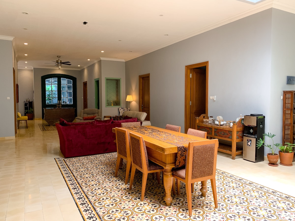 🏡 Villa privada: alquiler de toda la propiedad El precio que se muestra es para toda la villa, no por habitación. Durante tu estancia, toda la propiedad es exclusivamente tuya, no habrá otros huéspedes presentes. Con 8 amplios dormitorios, una gran piscina de 15x9 y 1.400 m² de espacio habitable, puede alojar cómodamente hasta 20 huéspedes. A solo 3 km de la ciudad y a 20 minutos del centro de la ciudad de Yogyakarta, es perfecto para familias, amigos o retiros, rodeado de paz y comodidad tropicales. 🌴✨