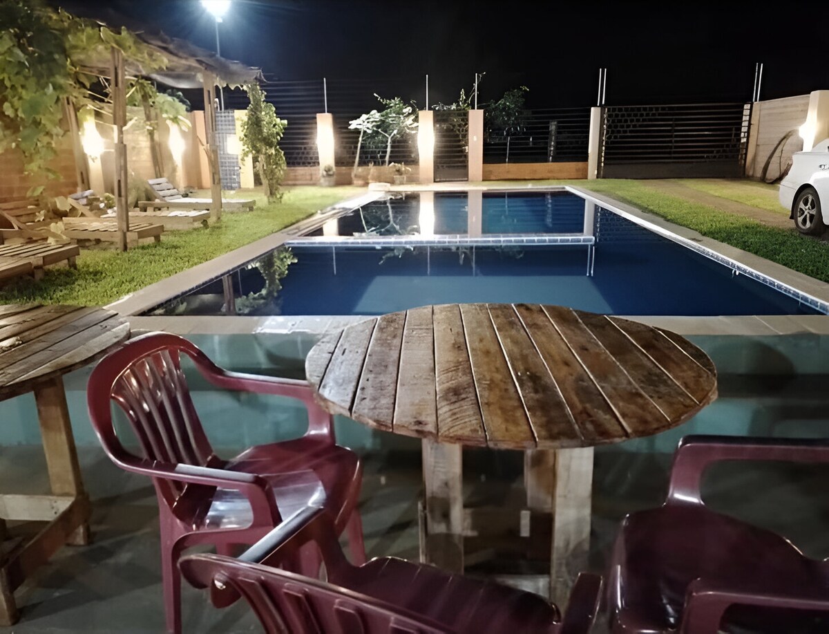 Ven a vivir un tiempo de relax, con la familia! El chalet esta equipado con todo lo que necesitas para que tu estadia sea comoda y placentera. Vas a sentirte en casa, estando lejos de casa...Con la piscina, espacios verdes y un ambiente tranquilo y seguro para ti y tu familia...!
