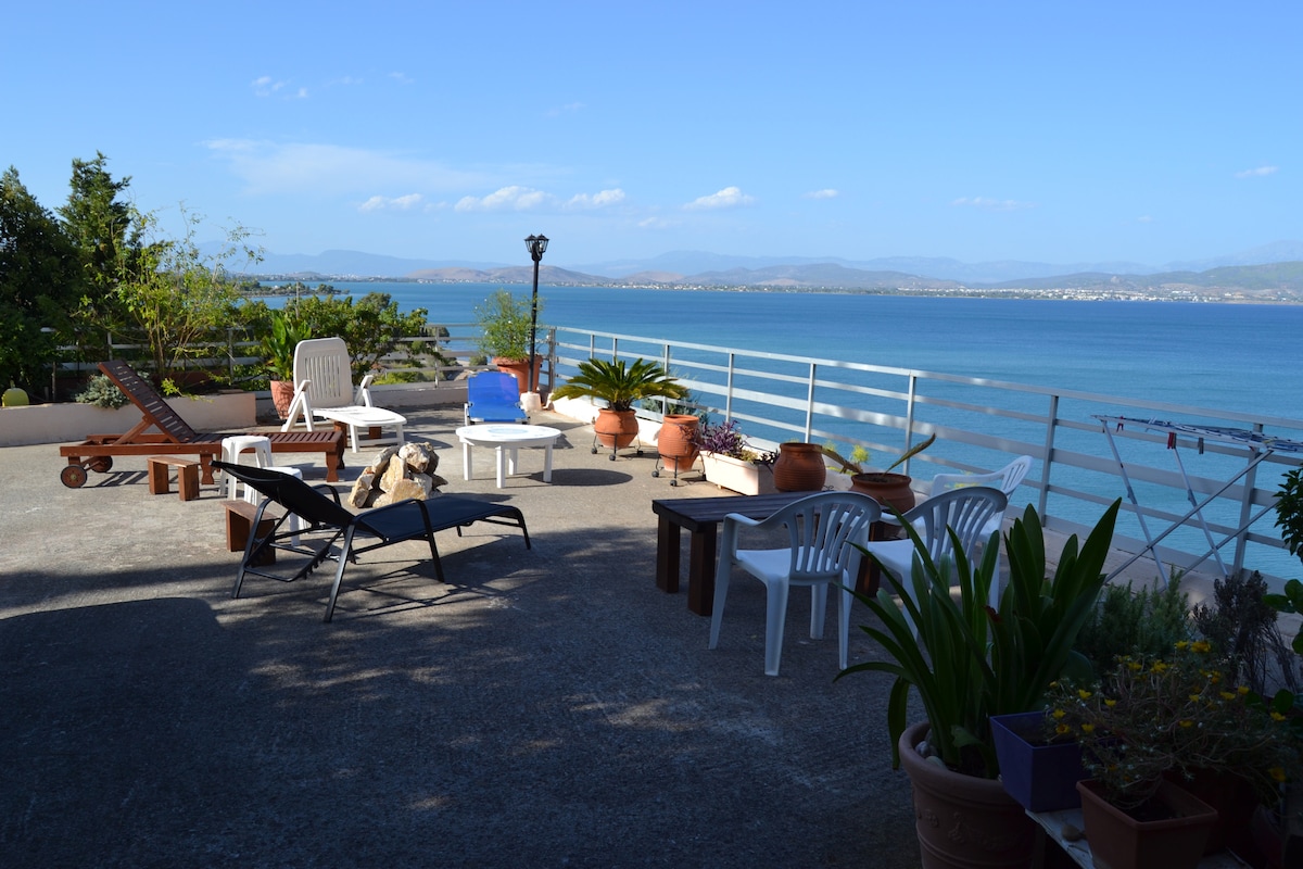 Una casa de vacaciones de 2 dormitorios frente al mar ideal para 4 a 5 personas, con acceso directo a una playa privada, ubicada en un entorno maravillosamente sereno con vistas al mar, a 1 hora y 15 minutos en coche del Aeropuerto Internacional de Atenas. La casa goza de una vista panorámica al mar, está renovada y está diseñada y decorada profesionalmente. NOTA: En caso de que tus fechas deseadas no estén disponibles, ¡consulta mis otros anuncios de dos nuevas propiedades adyacentes a esta!