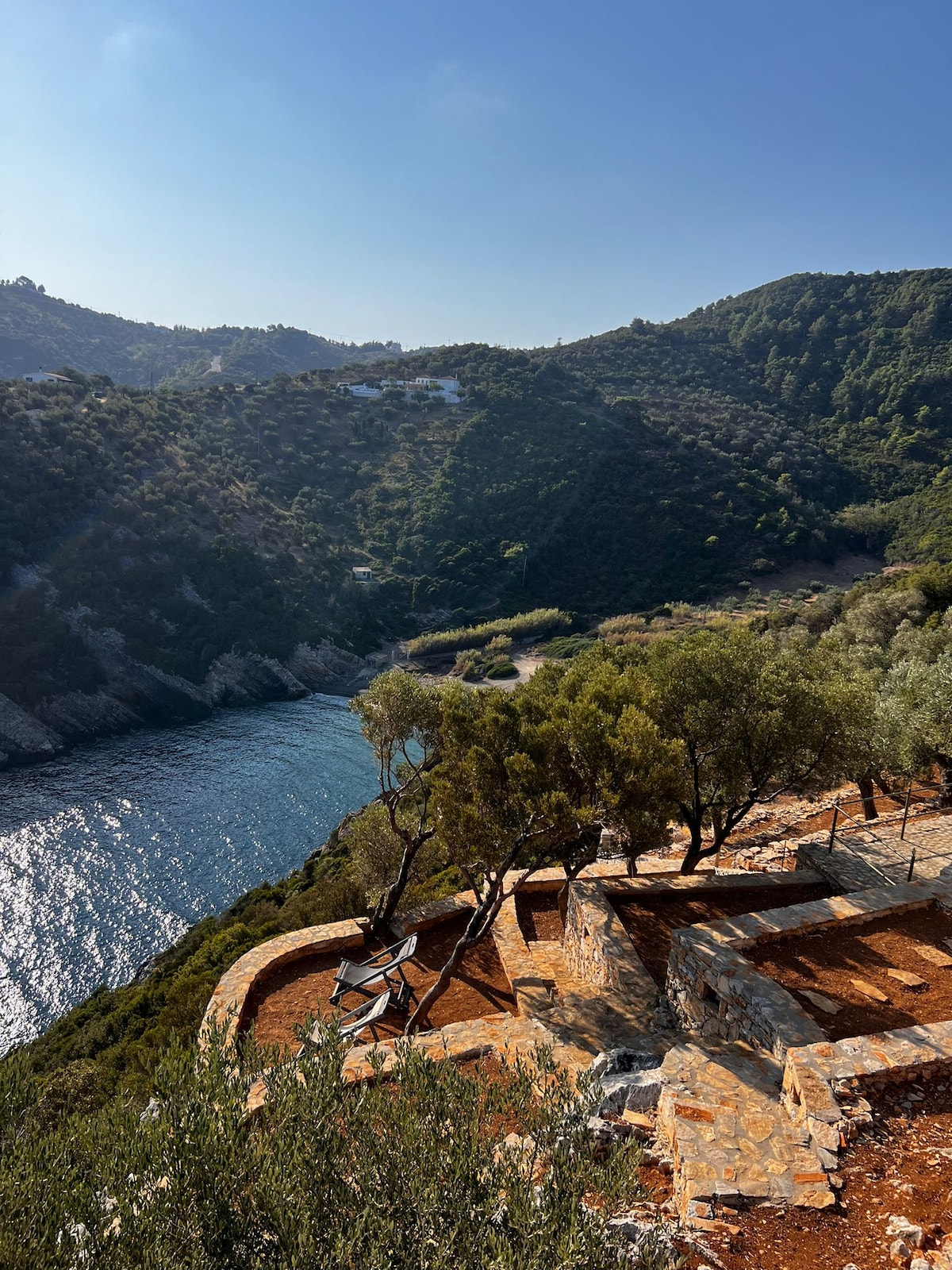 Villa de piedra con amplias terrazas privadas y bancos de piedra hechos a mano, con vistas al azul infinito del Mediterráneo. Por la noche, disfruta del espectáculo que las estrellas preparan para ti. Tu privacidad en la naturaleza es lo que más importa aquí. ¡A 650 metros a pie del mar! Nuestra tierra es un olivar situado a 1,3 km del casco antiguo de Alonissos, accesible por un camino de grava de 1 km que baja cuesta abajo. Allí se encuentran 3 villas construidas en piedra rodeadas de amplias terrazas de piedra y vistas impresionantes al azul del Egeo.