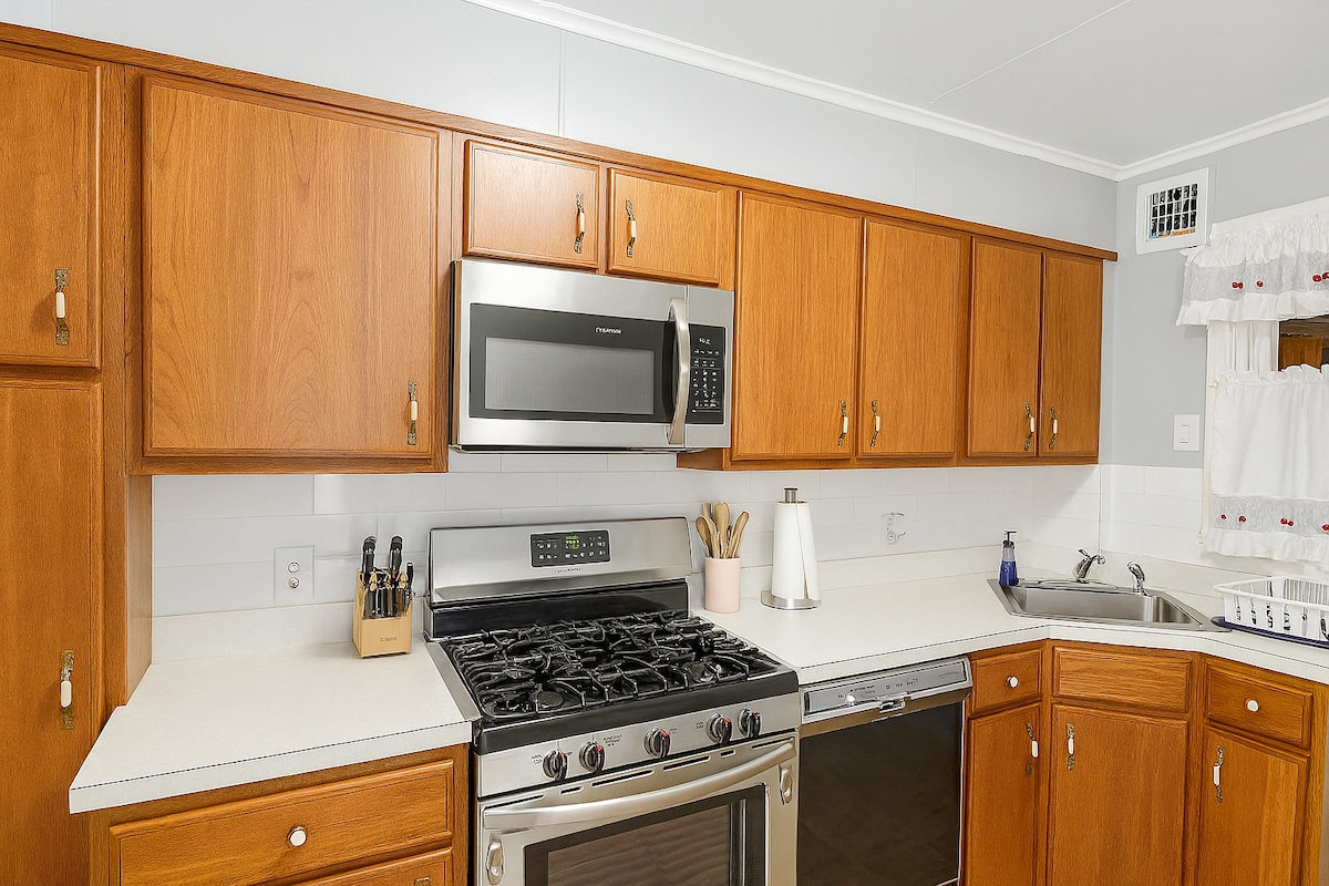 Bonito estudio rural con cocina completa y lavandería.