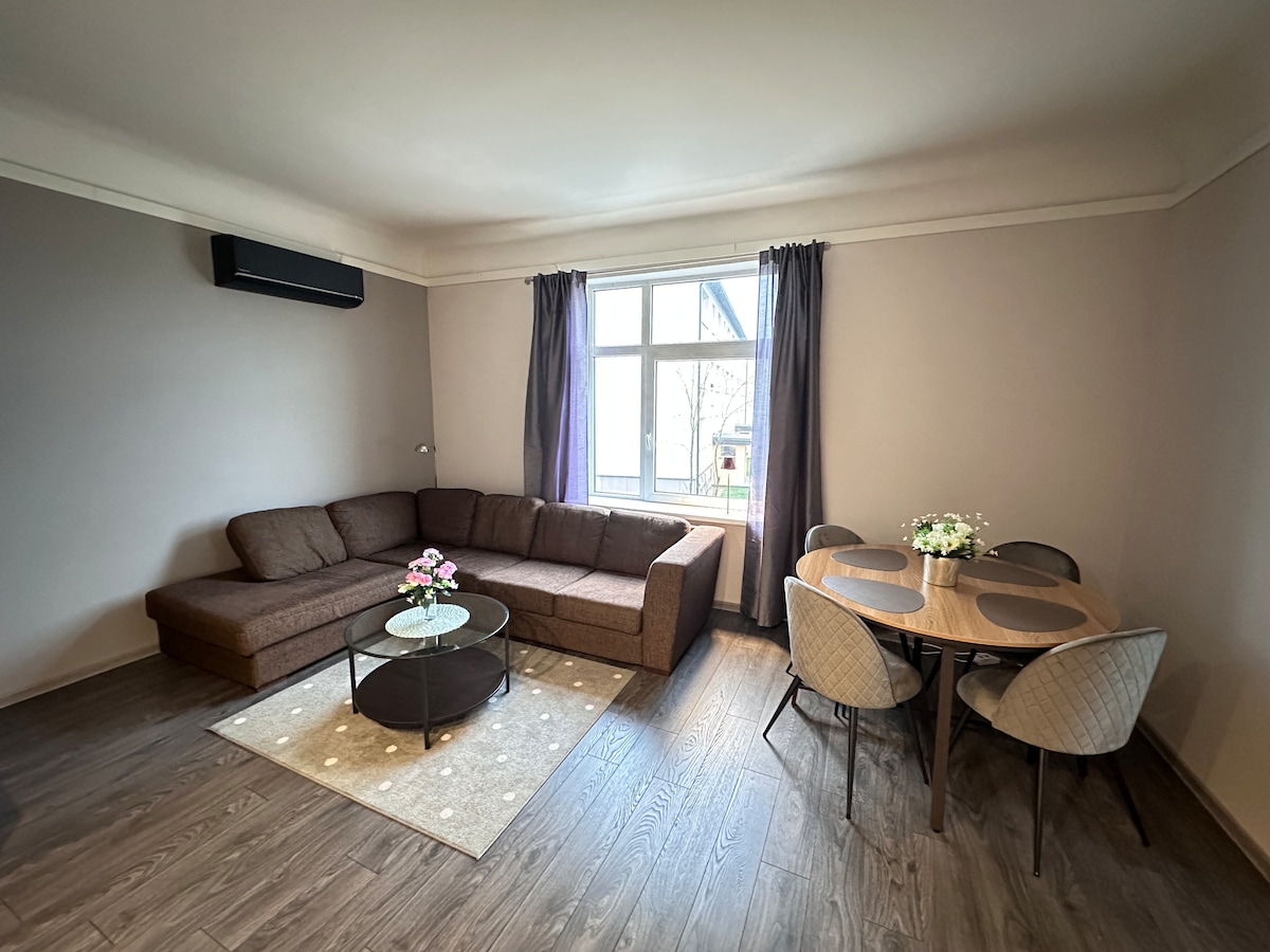 Este hermoso apartamento de 1 dormitorio, recién renovado, está situado en el centro de la ciudad, al final de la calle principal. El departamento está en el segundo piso y tiene un pequeño balcón. Hay un hermoso salón con cocina abierta. La cocina está totalmente equipada con nevera, horno, estufa, hervidor de agua, tostadora y cubiertos. El dormitorio tiene una cama para dos personas (160 cm de ancho). Además, los huéspedes pueden usar un cómodo sofá cama en la sala de estar para dos personas.
