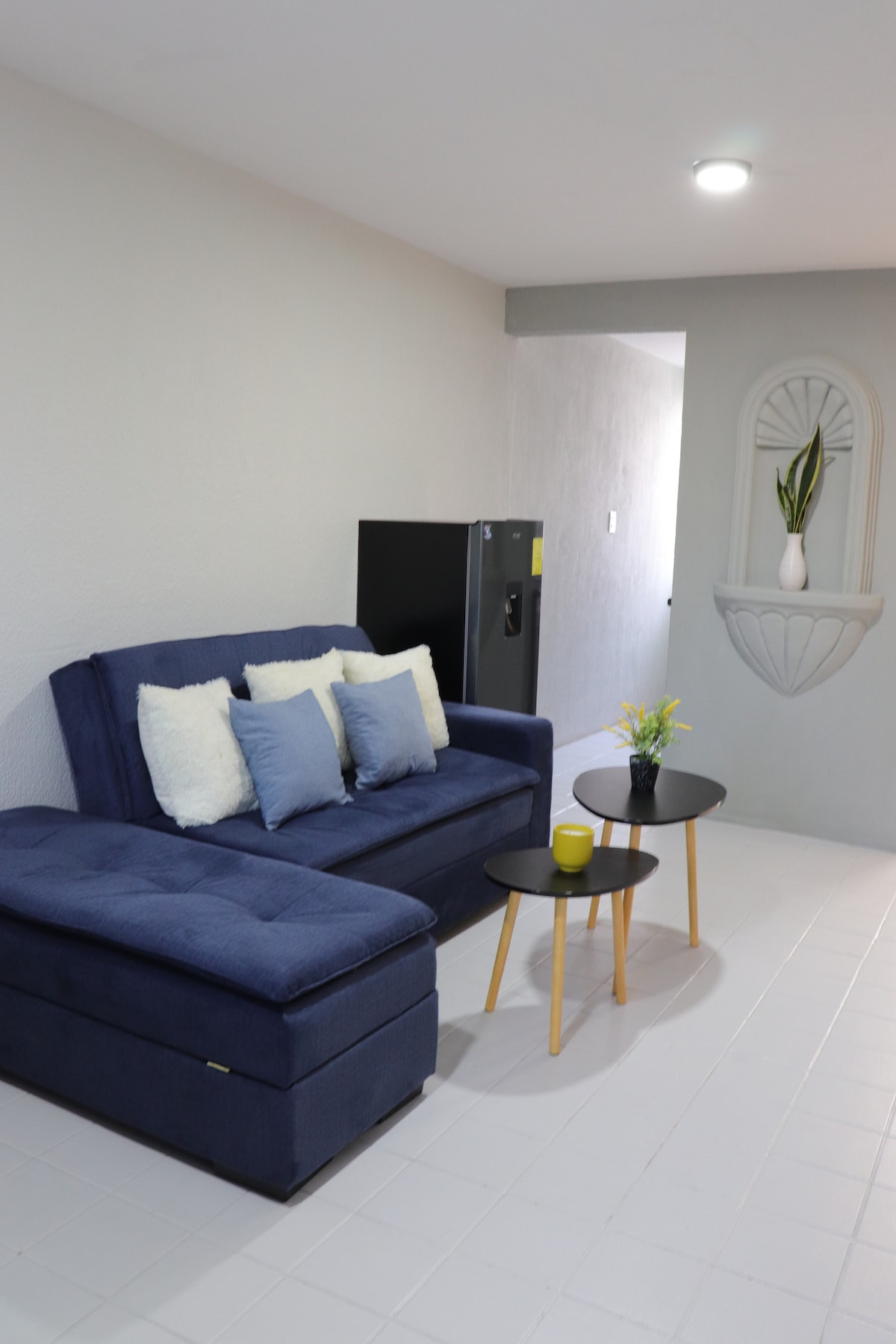 Hermoso Departamento con amplia terraza, limpio y muy acogedor. la construcción es nueva, así como los muebles que hay en su interior. el departamento es de concepto abierto, solo hay un biombo que separa el área del dormitorio con la sala, para dar un poco de privacidad. Hay un sofá cama, tamaño matrimonial, en la sala El departamento tiene amplias ventanas que brindan una excelente iluminación. y cuenta con una linda terraza, rodeada de plantas.