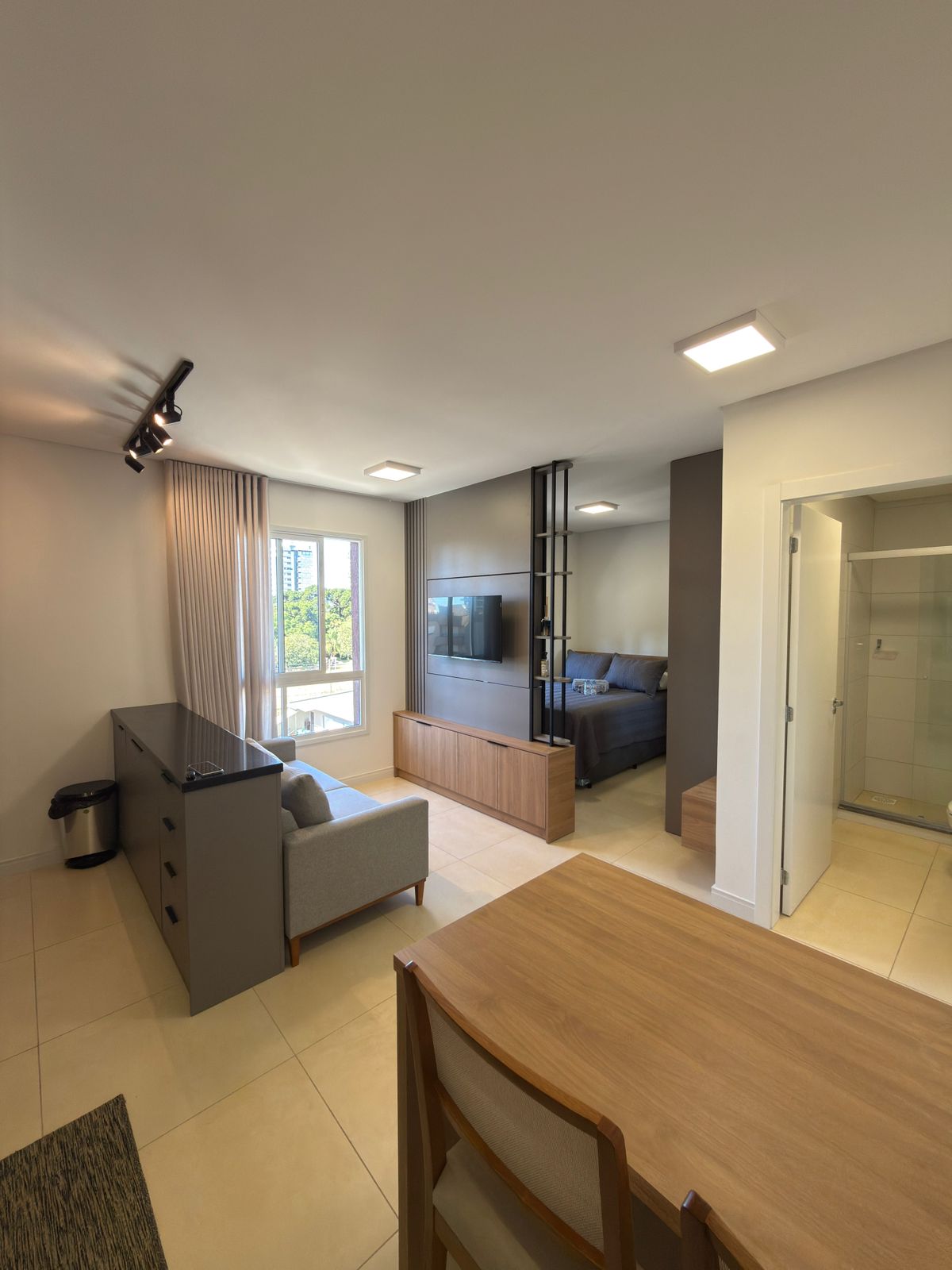 Estudio acogedor en el centro de la ciudad, ideal para hasta 3 personas. Excelente ubicación, a solo una cuadra del centro comercial Bella Città y cerca de mercados, farmacias, parque, catedral y restaurantes. Estudio con muebles nuevos y planificados, diseñado para ofrecer practicidad y comodidad durante tu estancia. ¡Estacionamiento en garaje incluido, comodidad y seguridad!