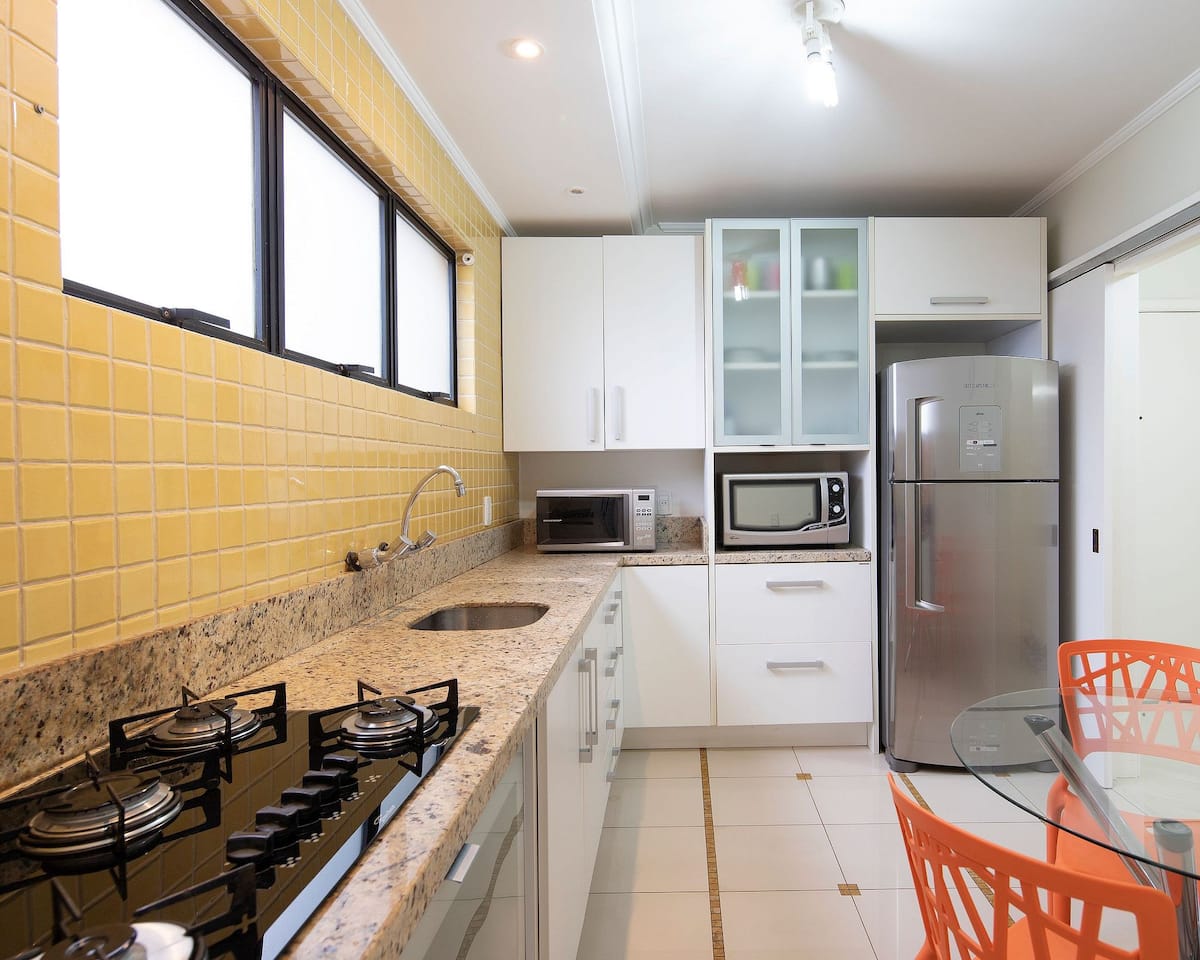 Estudio súper céntrico en el piso 17 en un edificio nuevo con gimnasio, terraza y minimercado. Plaza de estacionamiento privado, aire acondicionado, cocina completa, lavadora, ropa de cama, colchón Castor, almohadas, mantas y toallas. Internet privado de 360 mb con gran espacio de oficina en casa con escritorio grande y silla ergonómica. Muy tranquilo y seguro. Puntos cercanos: Fleming Medicine 550 m, Atitus 700 m, FGV 450 m. Restaurantes, farmacias y mercados a pocos metros.