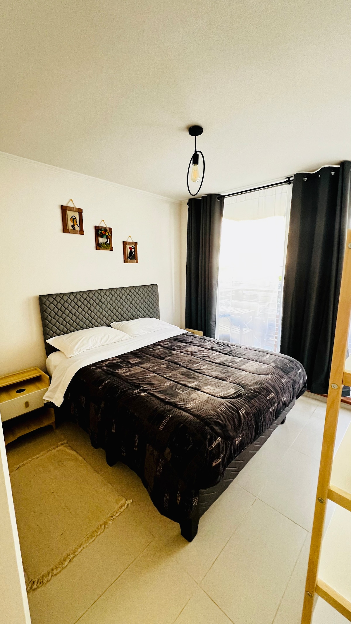 Departamento estudio cercano al centro. Completamente amoblado, con ventanas de termopanel y vista al volcán. El dpto incluye: Cama matrimonial Cocina americana equipada Amplia terraza equipada Parrilla eléctrica Calefactor eléctrico Estacionamiento privado *Se desinfecta con Amonio Cuaternario. Otros servicios: Piscina exterior, gimnasio, sauna, sala de juegos, quincho y lavandería. Arriendo de bicicletas de diciembre a marzo.