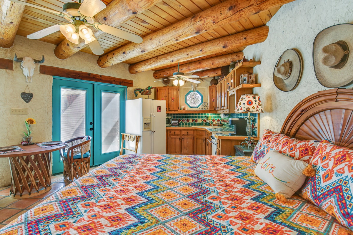 Disfrute de este mini-estudio cómodamente equipado con cama king size, baño grande con bañera y ducha de azulejos, cocina comedor, además de mini-nevera, fregadero, microondas y cafetera. Como se agregó, además, siéntate afuera en la pequeña terraza y disfruta de lo mejor de Ruidoso. Hay una pequeña zona vallada de forma completa y segura para que tu compañero de viaje con un perro pequeño. ¡Este gran escondite está a solo unos pasos del centro del distrito a pie del centro de Ruidoso lleno de tiendas, restaurantes, galerías y vida nocturna!
