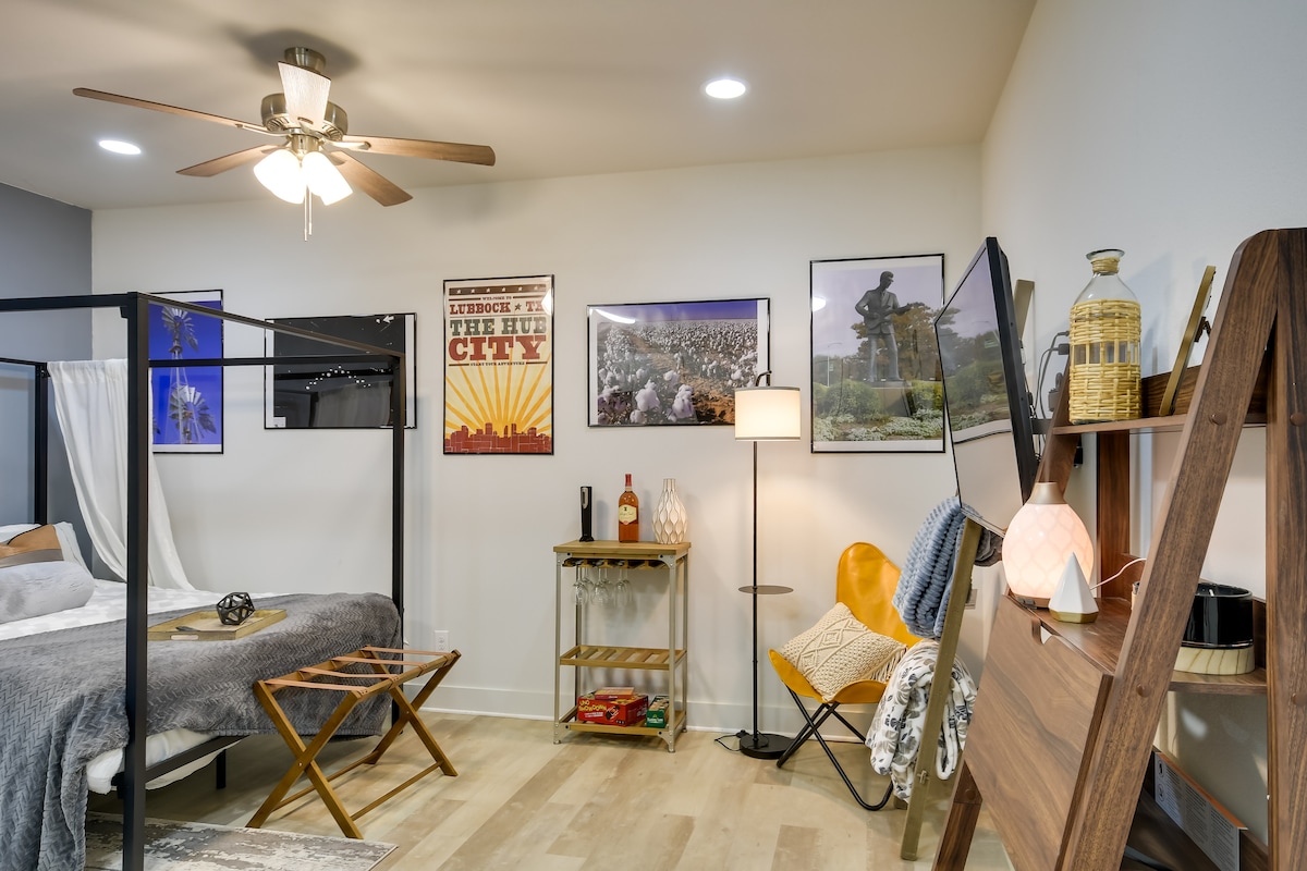 ¡Hola y bienvenido a Lubbock, la capital original de la música en vivo de Texas! Construido originalmente en 1924, este edificio histórico ubicado en el centro de Lubbock se utilizó como estación de servicio de automóviles durante muchos años. Nuestro loft temático Bob Wills y Texas Swing Music está lleno de tesoros locales y decoración inspirada en la música country. Sumérgete en la cultura de la ciudad aquí mismo, en el centro de Lubbock, donde leyendas de la música como Buddy Holly y Mac Davis comenzaron sus icónicas carreras.