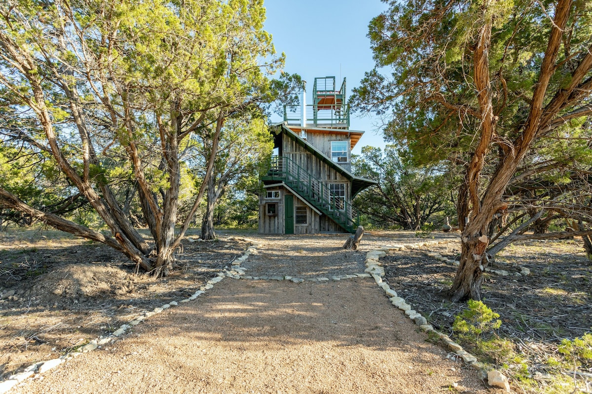 Explora un amplio mirador de Texas Hill Country. Esta casa del árbol construida a mano y única en su tipo está enclavada en 37 acres boscosos. Con su diseño único y sus interiores elegantes, su sendero de senderismo de media milla, sus hamacas y su porche con mosquitero, la casa del árbol te invita a relajarte, descansar y recargar energías en la naturaleza. Aquí no estarás rodeado de otros alojamientos en Airbnb. Reserva una o dos noches y disfruta de un poco de paz. (La escalera exterior cubierta te lleva desde la cocina/baño de abajo hasta el dormitorio del segundo piso).
