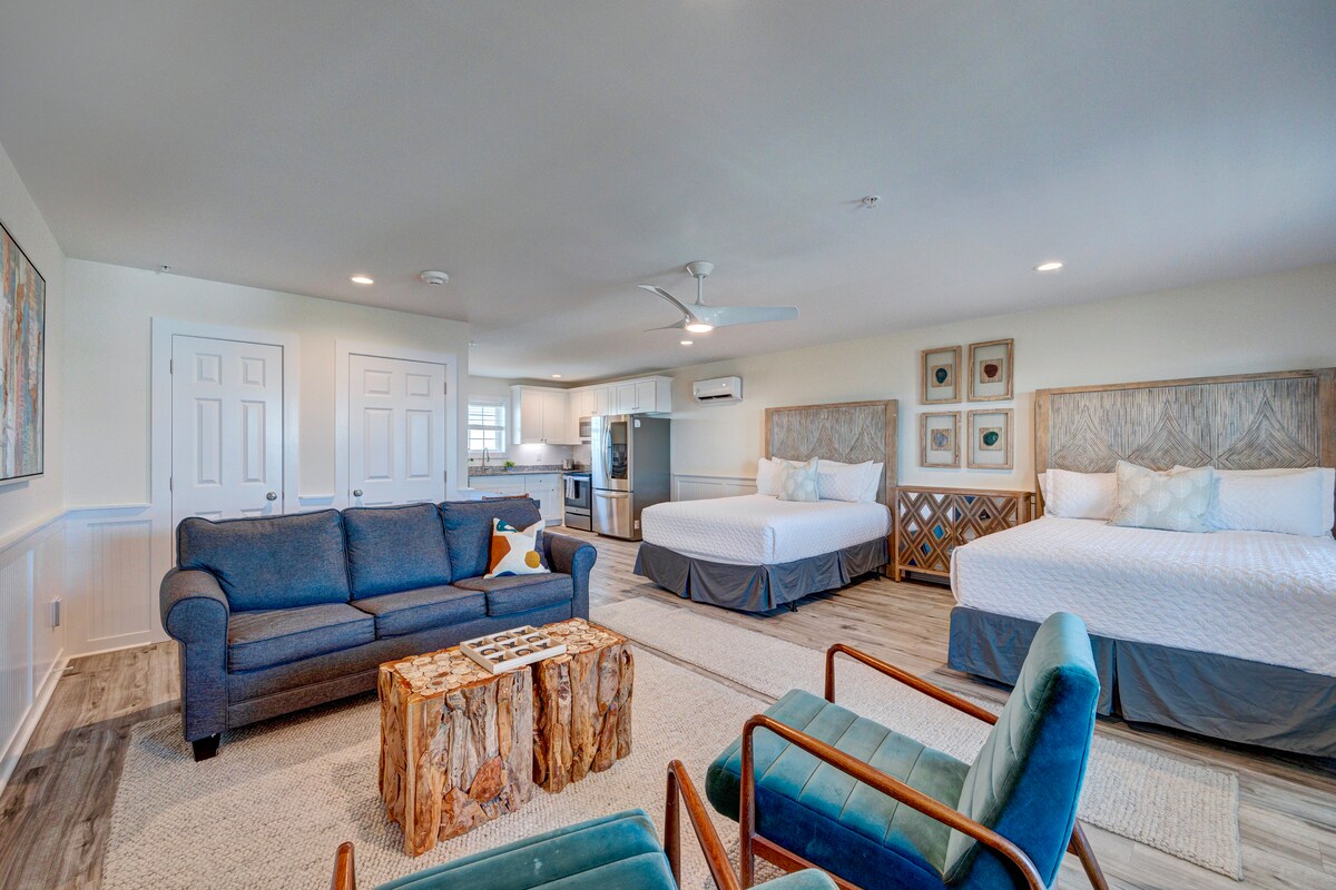 Presentamos el hotel más nuevo de Topsail Island construido en 2022, donde el lujo se encuentra con la comodidad y las impresionantes vistas del océano te esperan. Esta espaciosa suite con cama tamaño king ADA tiene una cocina moderna con electrodomésticos de granito y acero inoxidable, un comedor, sala de estar con sofá cama, sillas de club y un televisor inteligente de 75pulgadas, así como una ducha a ras de suelo con ducha de mano. Esta suite de hotel híbrida privada del primer piso con 700 pies cuadrados de espacio habitable moderno es el lugar perfecto para relajarse y vacacionar.