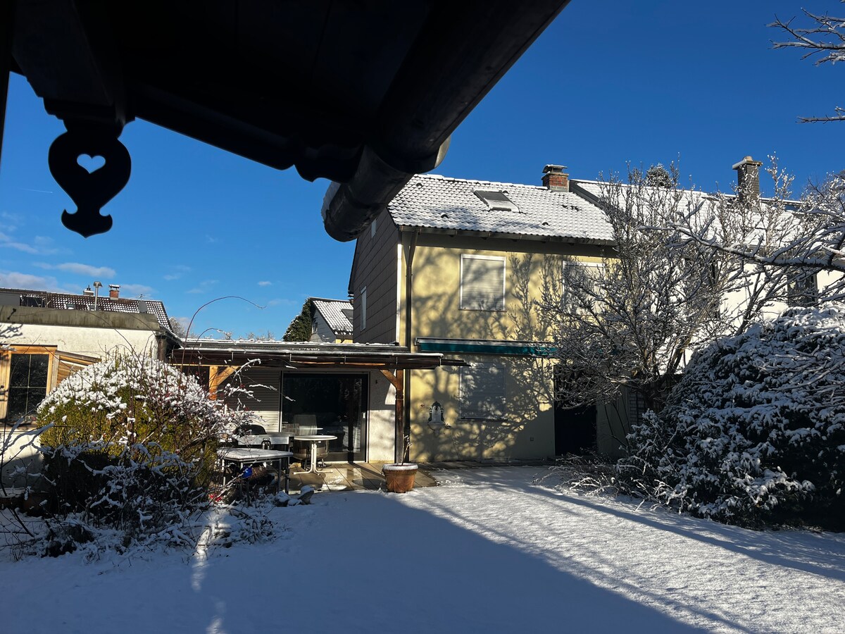 Nuestra acogedora casa con gran jardín privado se ubica en una de las mejores ubicaciones a las afueras de Múnich: lo suficientemente lejos del ruido de la ciudad y lo suficientemente cerca como para llegar a todo rápidamente. Si buscas paz y todavía quieres llegar a Múnich y sus alrededores de forma rápida y cómoda, te gustará. La ubicación es ideal: En 6 minutos estás a pie en el S-Bahn, desde allí es: Centro: 15 minutos Feria: 30 minutos. Oktoberfest: 28 minutos Supermercado: a 5 minutos a pie. Aeropuerto: a 40-50 min.