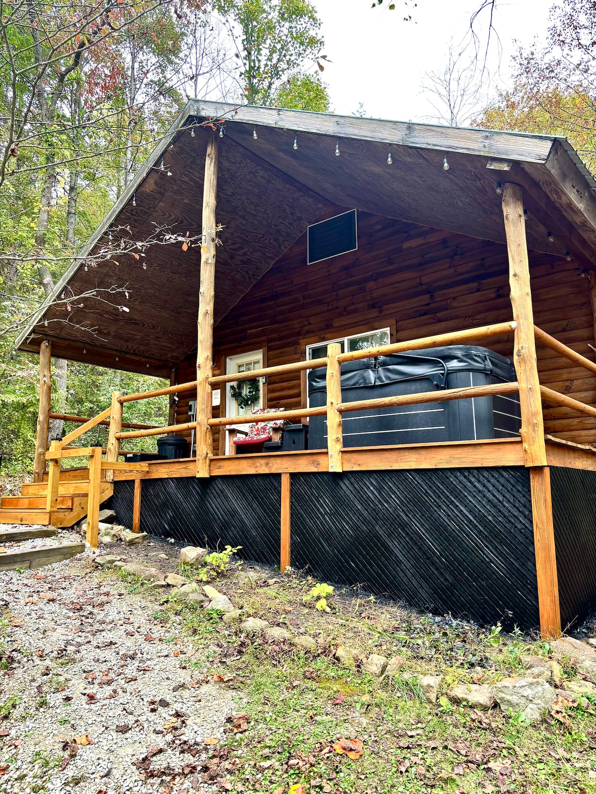 Plano de planta de una habitación. Capacidad para 2 personas. Esta acogedora cabaña tiene una terraza exterior cubierta con jacuzzi exterior, bañera de hidromasaje interior, parrilla de gas, wifi gratuito y calefacción y aire acondicionado centrales. Situado a 6 millas del centro de Logan y a unos 25 minutos de todos los parques estatales de Hocking Hills. Estás rodeado de zonas boscosas, por lo que tienes mucha privacidad. La terraza trasera tiene vistas a un barranco donde puedes ver ciervos y otros animales salvajes. Debes tener al menos 21 años para alquilar esta instalación.
