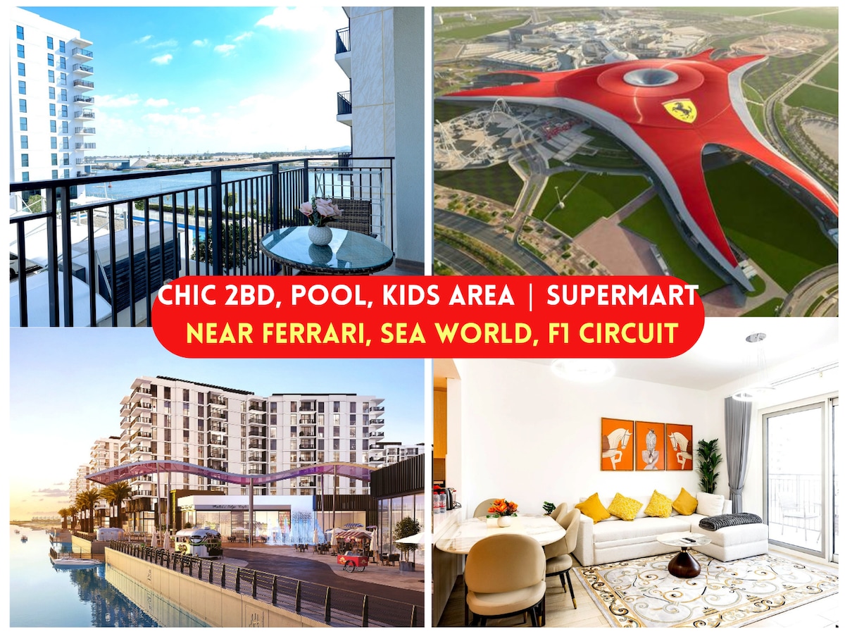 ¡Alójate en este espacioso apartamento de 2 dormitorios con vistas panorámicas al canal! Perfecto para familias y profesionales. - Ubicación privilegiada: a 5-7 minutos de Ferrari World, Warner Bros World, Circuito F1, SeaWorld, Etihad Arena, Yas Mall y el aeropuerto de Abu Dhabi. - Ventajas del resort: piscina, gimnasio, área de juegos para niños, estacionamiento gratuito. - Comodidad de lujo: 1 cama tamaño king y 1 cama tamaño queen y 1 sofá cama tamaño queen, balcón, cocina completa, lavadora/secadora. - Apto para familias: cuna y silla alta gratuitas (bajo petición y disponibilidad), TV inteligente (Prime/Starz), wifi de alta velocidad.