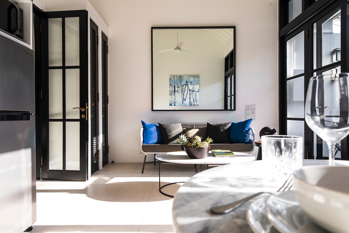 Enjoy your romantic private times in a luxurious complex, close to a fine selection of world-class cafes, restaurants and beach clubs. But perfectly hidden in a serene and quiet villa neighbourhood. This villa features an ensuite bathtub and offers a perfect dip-in pool. Enjoy your floating breakfast under the wood panels with sunlight gently pouring through. Chillax on the bean bag or sun loungers at your choice while soaking up the view of the garden.