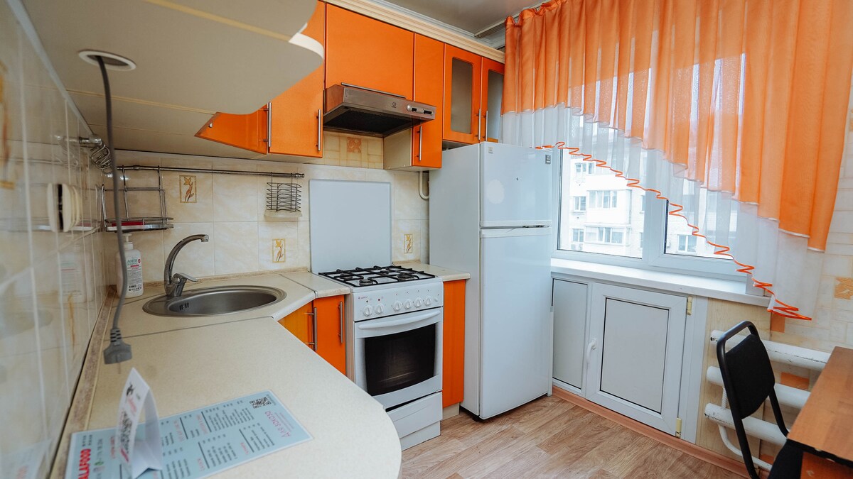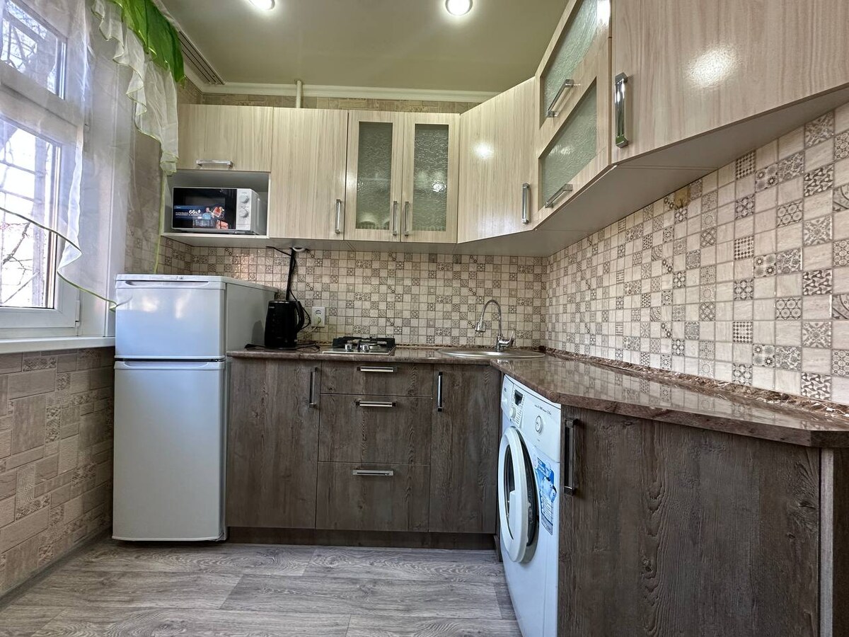 Te damos la bienvenida a nuestro acogedor yhermoso departamento Aquí encontrarás no solo un departamento, sino un ambiente de comodidad y estilo. Limpia,renovada ycómoda. La casa nueva es 2023 Muy cerca está la escuela 8, estadio Avangard Cerradura electrónica Wifi de alta velocidad Televisión inteligente Dos camas dobles (1800*2000) Limpieza Lino blanco como la nieve,stretenza Champú, gel de ducha,pantuflas,cepillos de dientes. Tabla de planchar,plancha,secadora Cocina totalmente abastecida. El departamento no es para juerguistas Se suprime el humo Quinto piso a las 5 NO HAY ASCENSOR