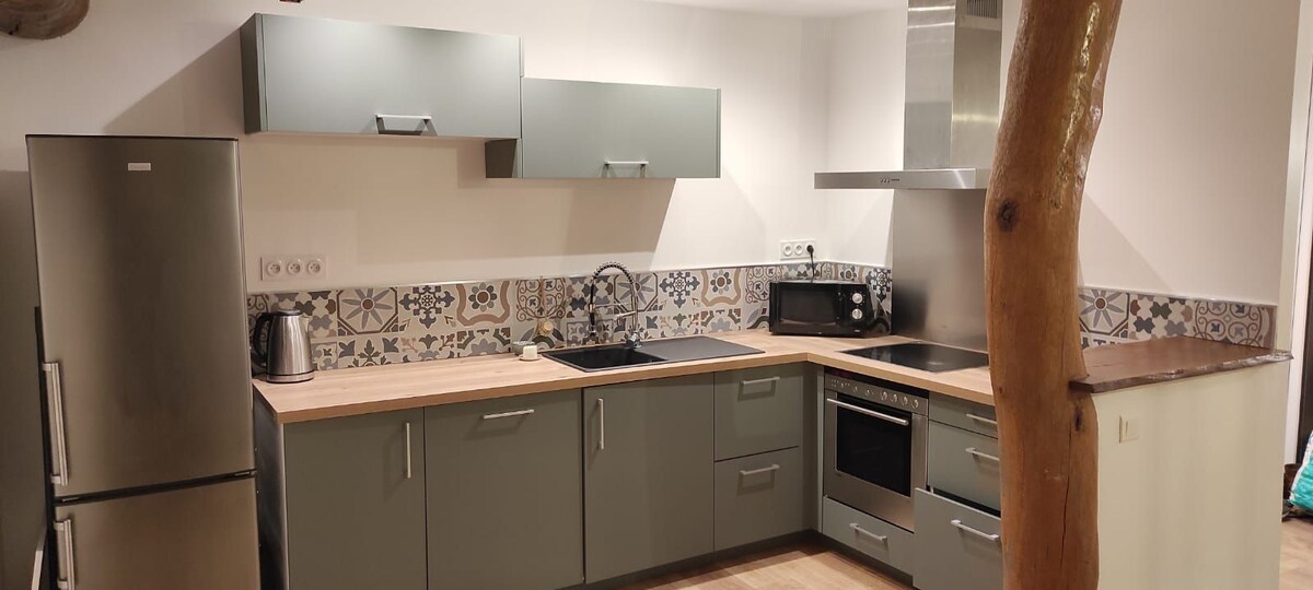 Love room con jacuzzi, escapada romántica para parejas. Venga a disfrutar de este magnífico apartamento con encanto con su terreno privado, tranquilo y sin vecinos. Jacuzzi (escondido en un hermoso chalet contiguo al alojamiento), pequeño gimnasio, chimenea, cama de 160x200 de gran marca bajo un cielo estrellado. Los ambientes luminosos se pueden elegir en el dormitorio, el baño y el chalet del jacuzzi. Escriba «video del apartamento de Fayé» en YouTube.