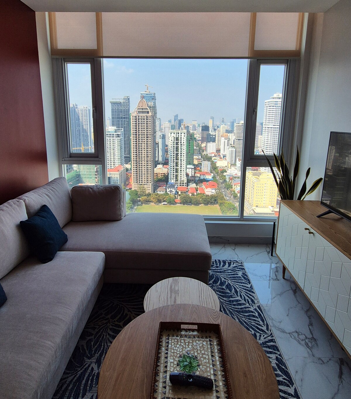 Esta propiedad especial se encuentra en una ubicación perfecta en el centro de la ciudad. Frente al apartamento hay un gran centro comercial y el hotel de cinco estrellas Sofitel, que es conveniente para que planifiques tu visita. - Equipado con televisor inteligente Samsung. - Equipado con cocina , nevera y hervidor de agua. - Equipado con lavadora y percha para ropa. - El bar más alto del cielo de Johnom Penh: Celeste y la piscina infinita de la azotea con vistas al río Mekong. - Equipado con gimnasio. - Se proporcionan adyuvantes Equipada con artículos de aseo básicos