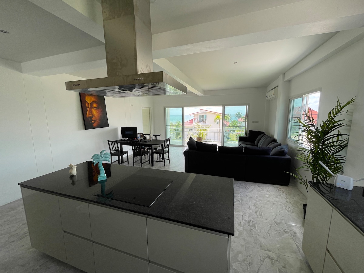 Un alojamiento frente a la playa ideal para familias con una cocina bien equipada y un comedor de planta abierta, TV inteligente y acceso directo a la playa. Amplia terraza privada frente al mar con tumbonas, sombrillas, mesa de comedor, asientos de salón y jacuzzi privado. Piscina compartida de agua salada y piscina infantil. Tres dormitorios tamaño king con baño en suite, dos con balcones con vista al mar. Ropa de cama y toallas incluidas. Terraza en la azotea con comedor y vistas. Aire acondicionado y ventiladores en todas partes. Limpieza semanal incluida.