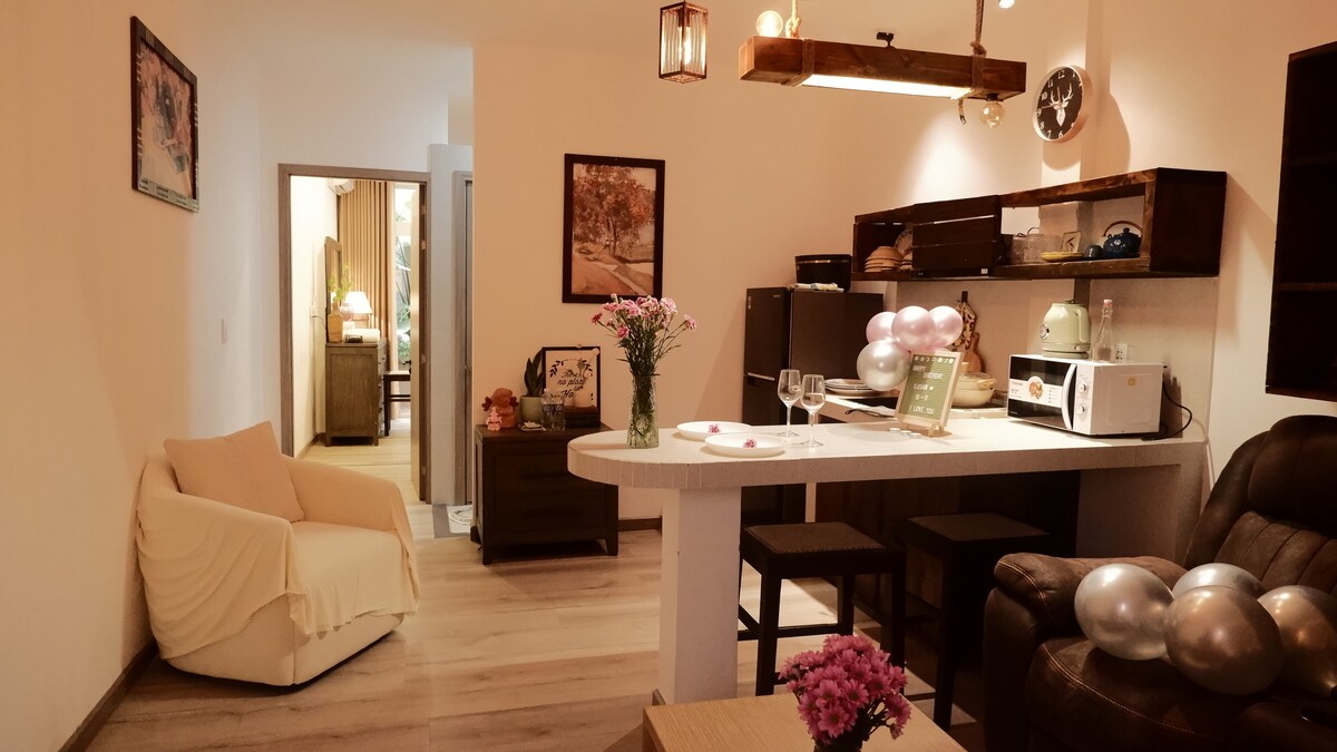Room 101 là một căn studio tiện nghi nằm ở vị trí tuyệt vời, cách sân bay 3 phút di chuyển và cách trung tâm 10 phút. - Căn phòng được thiết kế với phong cách japandi với full ánh sáng tự nhiên, nội thất gỗ và được trang bị đầy đủ đồ dùng bếp đem lại cảm giác ấm áp như ở nhà - Nằm trên tầng trệt với cửa đi riêng, rất riêng tư và dễ dàng mang hành lý vào. - Phòng được trang bị máy chiếu hiện đại cài netflix giúp bạn dễ dàng xem những bộ phim hay như một rạp chiếu phim mini tại nhà.